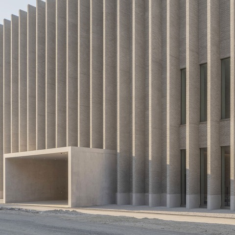 Las fachadas de ladrillo evocan la historia industrial del sitio y ofrecen una textura, un patrón vibrante para el monolito. En la plaza, el ritmo de las persianas verticales rompe la masividad del monolito y revela las aberturas. Por la noche, las persianas sirven de lienzo para difundir la luz proveniente del museo, transformando la fachada en la plaza.