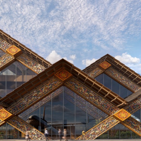 Una instalación en la XIXª Bienal de Arquitectura de Venecia contará con una pieza de madera en forma de diamante que refleja la fachada del aeropuerto. Esculpida en tiempo real, mitad por un artista butanés y mitad por máquinas, la exposición fusiona tradición e innovación, celebrando la herencia de la talla de madera de Bután a la vez que explora el papel de la tecnología en la conservación y el avance de la artesanía.