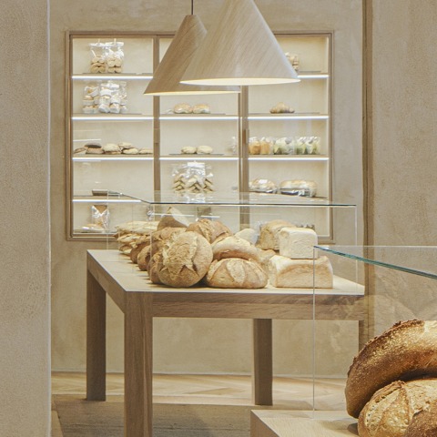 Proponemos la ruptura del esquema tradicional de panadería, muy jerarquizado y dividido por un expositor que define nítidamente el espacio público frente al privado. Tomando como referencia el esquema de comedor, con la mesa central como protagonista, desdibujamos ese límite para favorecer la experiencia del cliente, que no se reduce a mirar y pedir, sino que incluye el recorrido del local para un mejor conocimiento del producto expuesto. Este nuevo concepto, será acompañado desde el punto de vista material por maderas, textiles y vidrio, e iluminación focal y cálida, con el fin de reforzar la sensación de lugar con un carácter más doméstico, alejado del característico del retail.