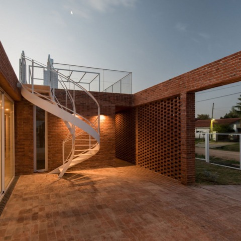 Con respecto al discurso planteado, buscamos que la planta baja sea un volumen macizo, mientras que el espacio de parrillero sea más bien un volumen liviano y transparente. Encontramos en el ladrillo un material capaz de lograr un volumen duro y a su vez con la suficiente versatilidad para lograr diferentes tipos de permeabilidad regulando así intimidad y entrada de luz manteniendo la lectura de volumen rústico y pesado. A su vez, permite una envolvente continua en todos los lados del prisma, incluyendo la cubierta, donde se implementa un sistema de sobre techo elevado para lograr esa continuidad material única. Se estudió cuidadosamente el aparejo de ladrillo, permitiendo lograr las permeabilidades cuando fueran necesarias sin interrumpir el ritmo del despiezo.