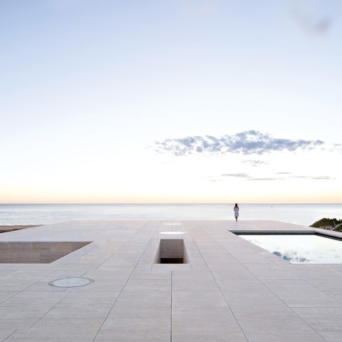 Allí hemos levantado una casa como si de un muelle frente al mar se tratara. Una casa que es un podio coronado por un plano horizontal superior. Sobre ese plano horizontal rotundo, despejado y desnudo, nos situamos frente al horizonte lejano que traza el mar por donde se pone el sol. Un plano horizontal en alto, construido en piedra, en travertino romano, como si fuera de arena, un plano infinito frente al mar infinito. Nada más y nada menos.