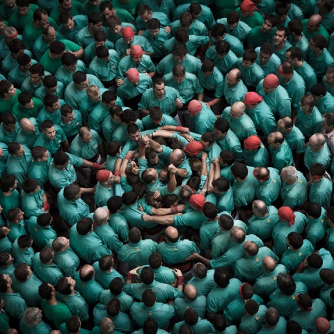 - Una base radial muy espandida o "pinya" que dará soporte al fuste principal o "tronc" sujetandose unos a otros por la espalda. En la formación de la "pinya", el conglomerado humano que forma la base de la torre, puede participar, en principio, cualquiera de las personas presentes.