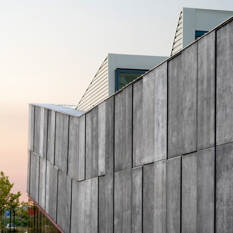 Los paneles prefabricados de hormigón se encuentran ligeramente desencajados entre si para romper la planeidad y generar un juego de luces y sombras que varía a lo largo del día y proporciona volumen a la fachada. Esta piel exterior es propia del uso industrial. Sin embargo, su textura, color y volumen ponen de manifiesto la peculiaridad del uso en su interior.