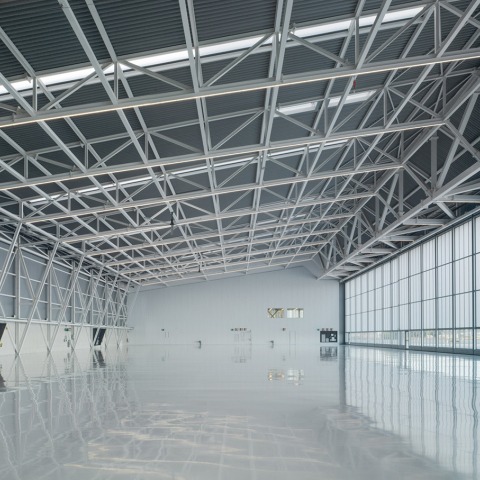 El diseño de la estructura ha sido uno de los grandes retos del proyecto y el elemento que más ha condicionado el aspecto final del edificio. La estructura se resuelve mediante pórticos rígidos metálicos a dos aguas con cerchas de canto variable. De la misma manera, se plantean dos apoyos que darán soporte a una cercha metálica de gran canto que posibilitará la apertura libre frontal de 100m para adaptarse a los requerimientos y exigencias funcionales del espacio.