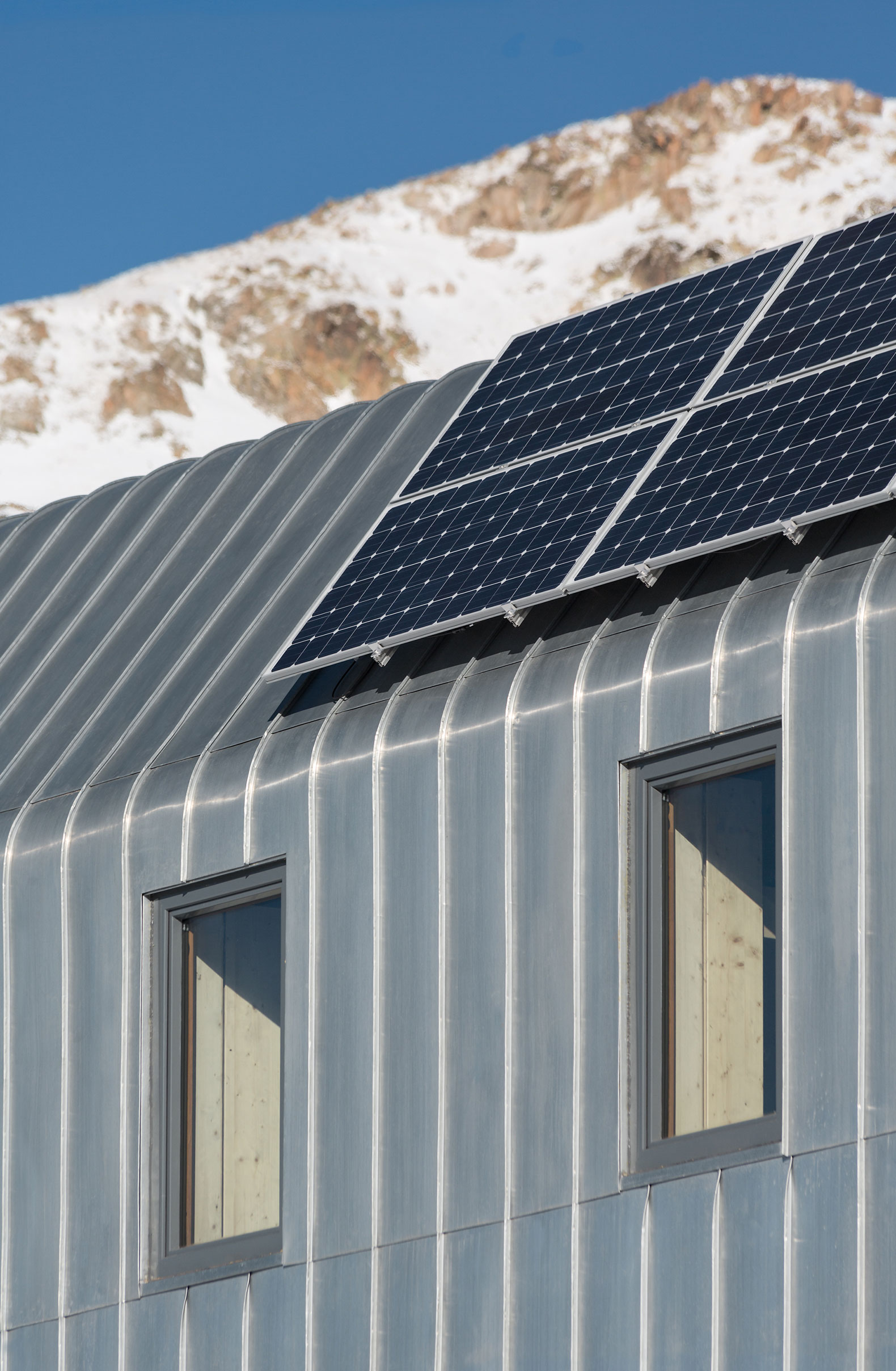 El edificio es energéticamente autónomo y está completamente desconectado de las redes. Un conjunto de paneles solares térmicos y fotovoltaicos, integrados en la cubierta inclinada a 52°, garantizan la producción de energía.