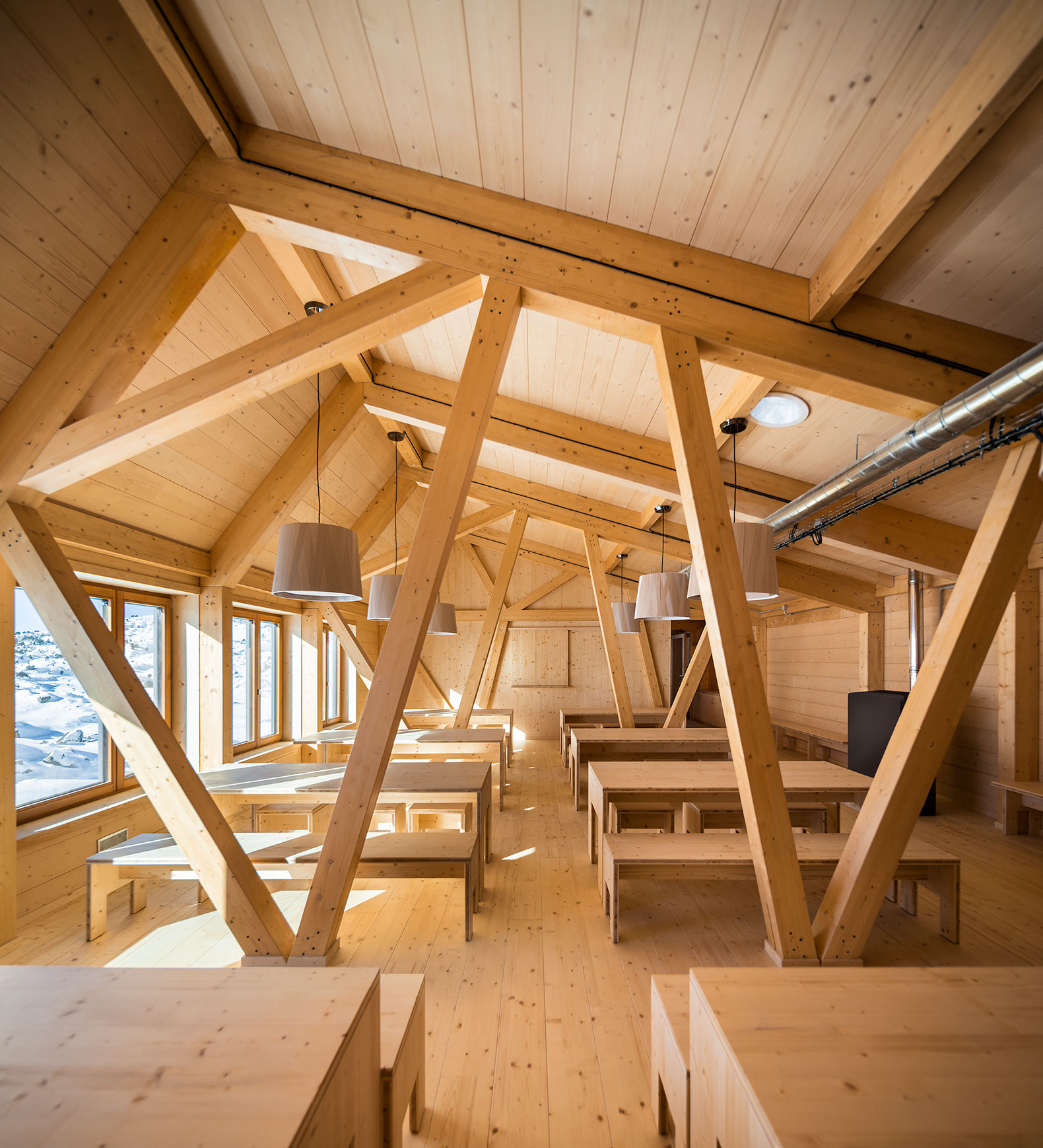 La estructura se resuelve mediante cerchas de madera laminada que aprovechan toda la sección para transmitir las elevadas cargas de nieve desde la cubierta hasta los muros existentes. La madera, dejada vista en el interior, aporta calidez, confort y una lectura honesta del sistema constructivo, reforzando el carácter acogedor en su interior.