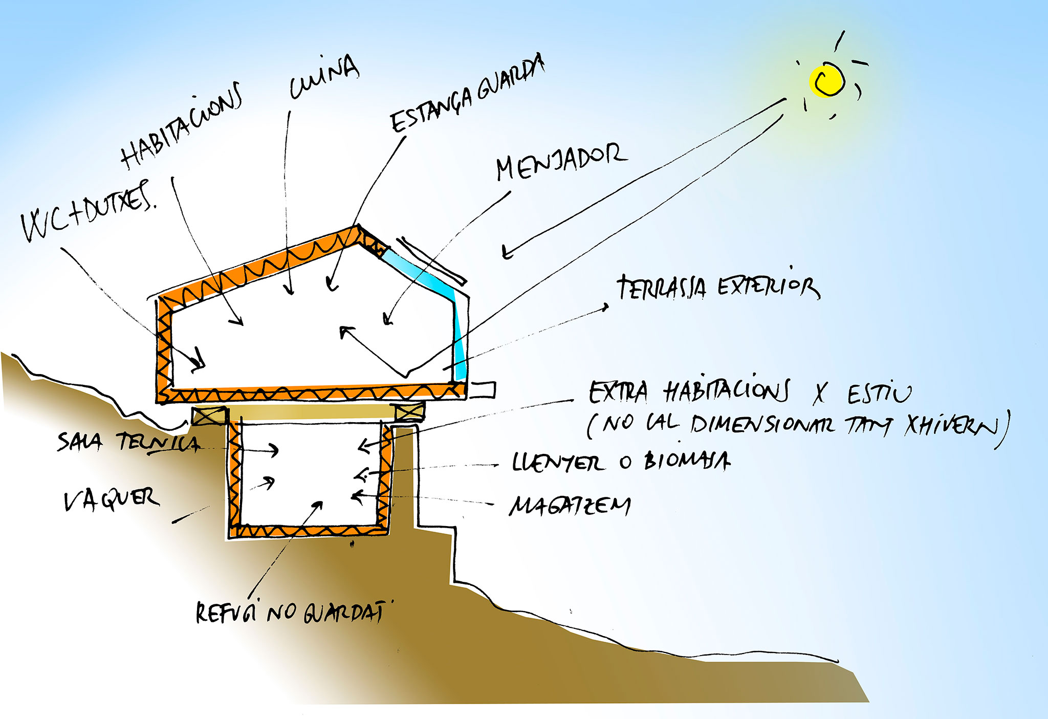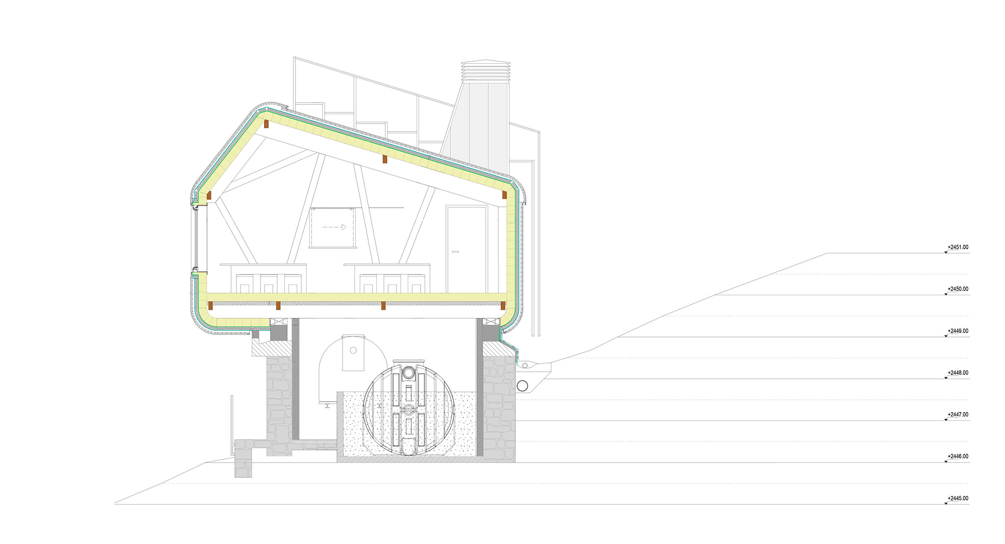 El proyecto se realizó con materiales prefabricados, utilizando madera laminada y una envolvente que mantiene su condición aislante para proteger del exterior, completando el conjunto con una serie de paneles solares térmicos y fotovoltaicos. El edificio fue levantado sobre los restos de muros de piedra pertenecientes a una construcción preexistente, que fueron utilizados a manera de zócalo estructural para lograr una edificación compacta, reducir costes y minimizar el impacto ambiental en el entorno.