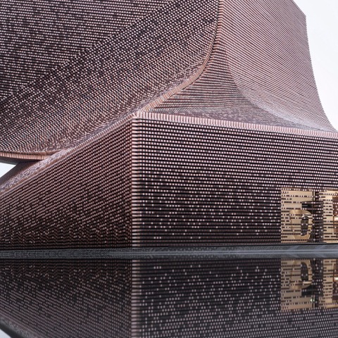Las unidades de muro cortina son lineales, de aproximadamente 1,2 metros de largo, y el ángulo de cada ladrillo cerámico se puede ajustar mediante pernos traseros. Al disponer las unidades en una superficie curva, la curva se desdobla y se divide racionalmente en unidades rectas teniendo en cuenta la densidad de las intersecciones de la superficie. La disposición de las unidades en la cara recta difiere de la cara curva, y se requieren líneas diagonales en la curva para realizar una transición suave a la cara recta. Para las intersecciones con ángulos pronunciados, las unidades se pueden rotar 90 grados localmente para garantizar la uniformidad. La complejidad y la precisión de la construcción de curvas tridimensionales e intersecciones de superficies se validaron con un modelo físico 1:1 en el sitio.