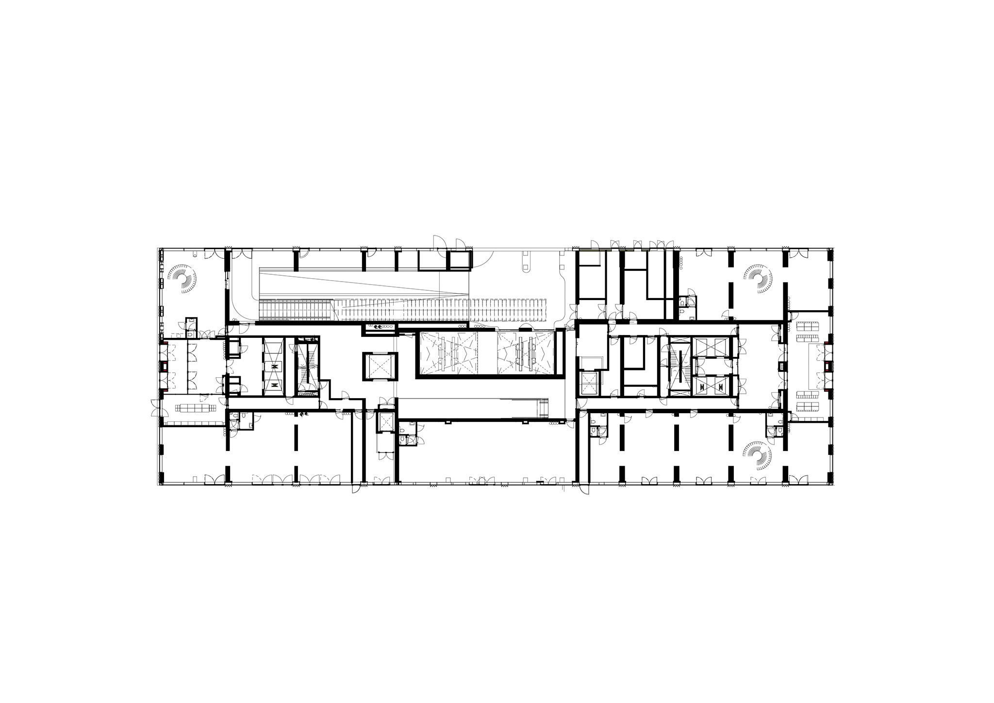 The Sax aspira a ser un barrio residencial vertical, una comunidad con zonas comunes y espacios al aire libre. Los residentes pronto podrán reunirse en diversos lugares: desde salones compartidos hasta la terraza comunitaria en la azotea, sobre la viga dorada que conecta las dos torres, que ofrece vistas espectaculares del puerto de Rijnhaven. Un pedestal transparente se eleva nueve metros de altura en las esquinas del edificio para dinamizar la base de las torres. Mientras que las plantas inferiores dejan espacio para los nuevos árboles en Antoine Platekade, más arriba en la fachada, los balcones se vuelven cada vez más profundos e incorporan ventanales, permitiendo a los residentes disfrutar de las hermosas vistas y salir de sus hogares para socializar con los vecinos. A partir de la viga dorada, los balcones de la torre más alta parecen ondular, otorgándole un ritmo dinámico y creando una variedad de tamaños de balcones.