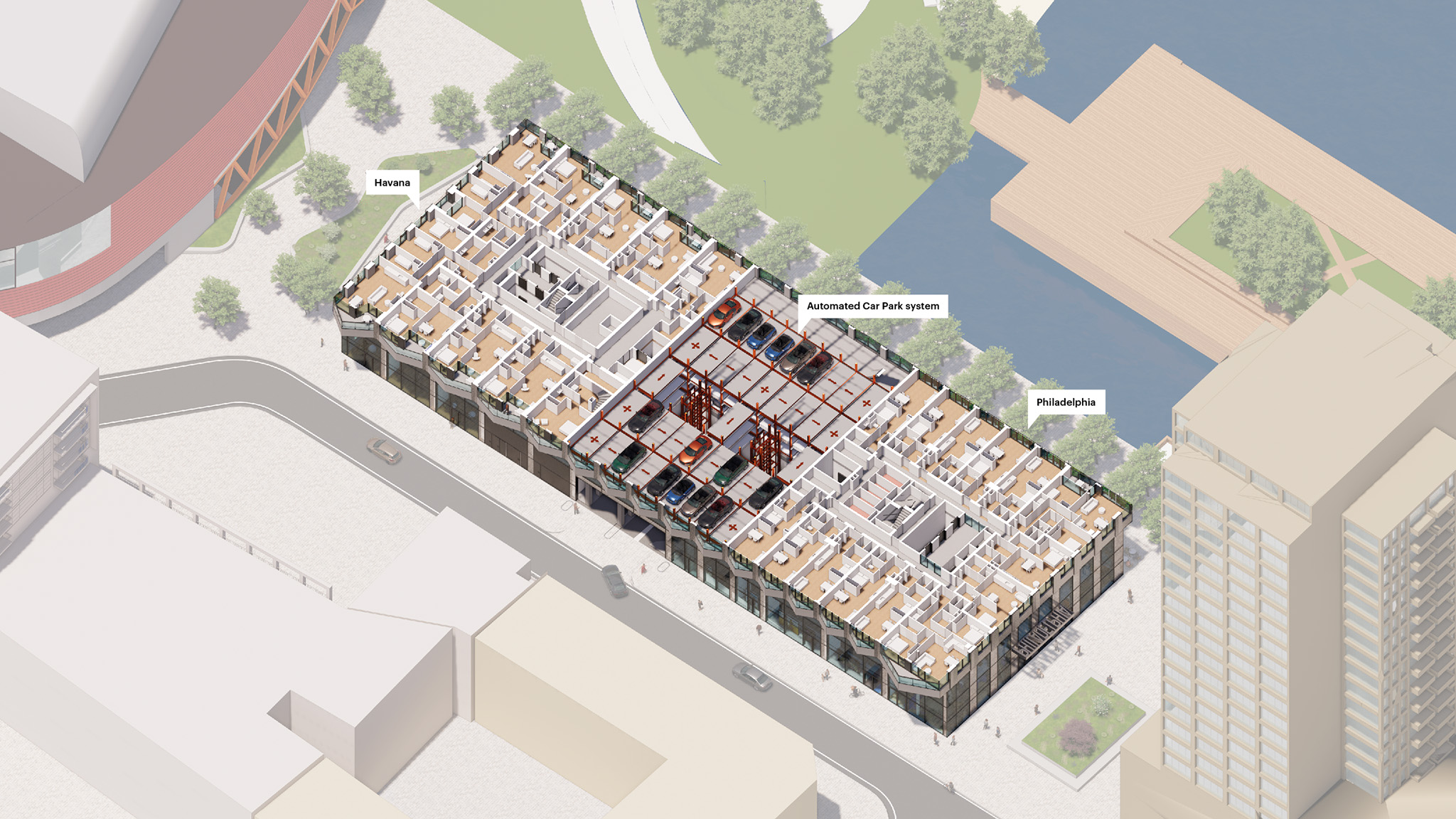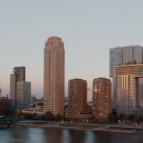 Compositivamente, la propuesta realizada por MVRDV integra dos torres -«Havana», de 180 metros y 55 plantas, y «Philadelphia», de 82 metros y 26 plantas- que se vinculan por una viga dorada que alberga seis plantas de viviendas y una terraza en la azotea a 100 metros de altura. Integrándose armoniosamente a su entorno dominado por algunos de los edificios más emblemáticos de la ciudad, la particular silueta del edificio reflejará el carácter dinámico de la ciudad portuaria neerlandesa.