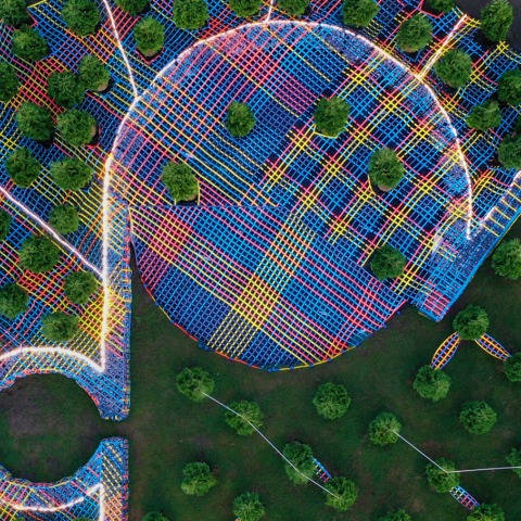 Una cuadrícula de 130 árboles Arbor Vitae vivos plantados en una red de nylon rosa, amarillo y azul a gran escala en el césped del palacio de justicia del condado de Bartholomew, forman esta instalación de SO-IL.