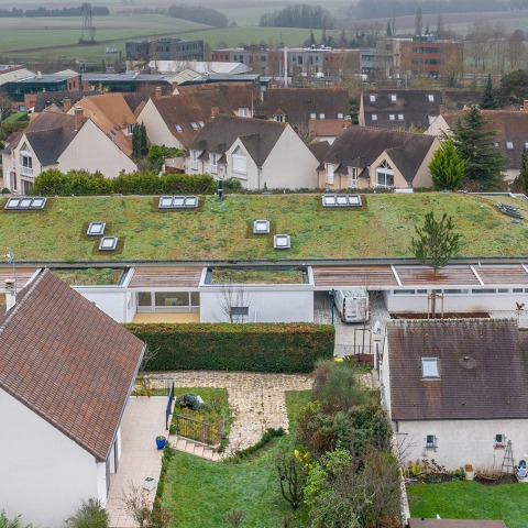 La guardería se instala en una construcción de una sola planta en una zona en pendiente, donde se extendía una extraordinaria escuela de ladrillos y madera, todo hecho de escaleras, rampas, entrepisos y recovecos ... El nuevo edificio está alojado bajo un vasto techo verde, que podemos vislumbrar entre los pabellones que descienden del ayuntamiento. Parece abordar la llanura agrícola, al otro lado de la carretera. Nadie le presta atención y para los vecinos, un prado es incluso mejor que un edificio.