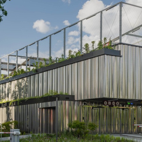 Mirando solo los cimientos del garaje, que se ha puesto en uso recientemente, revela el enfoque de los arquitectos para este sitio postindustrial. Las paredes metálicas del espacio de estacionamiento reflejan el entorno que lo rodea, agregando dimensión y vitalidad al campus. Los perfiles de acero actúan como soporte para las plantas que crecerán para cubrir el edificio con el tiempo, creando una zona de relajación aislada. Las plantas también crecerán en macetas que recubren el exterior del edificio.