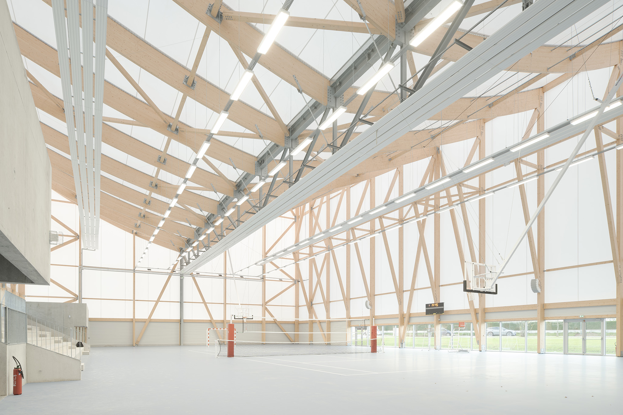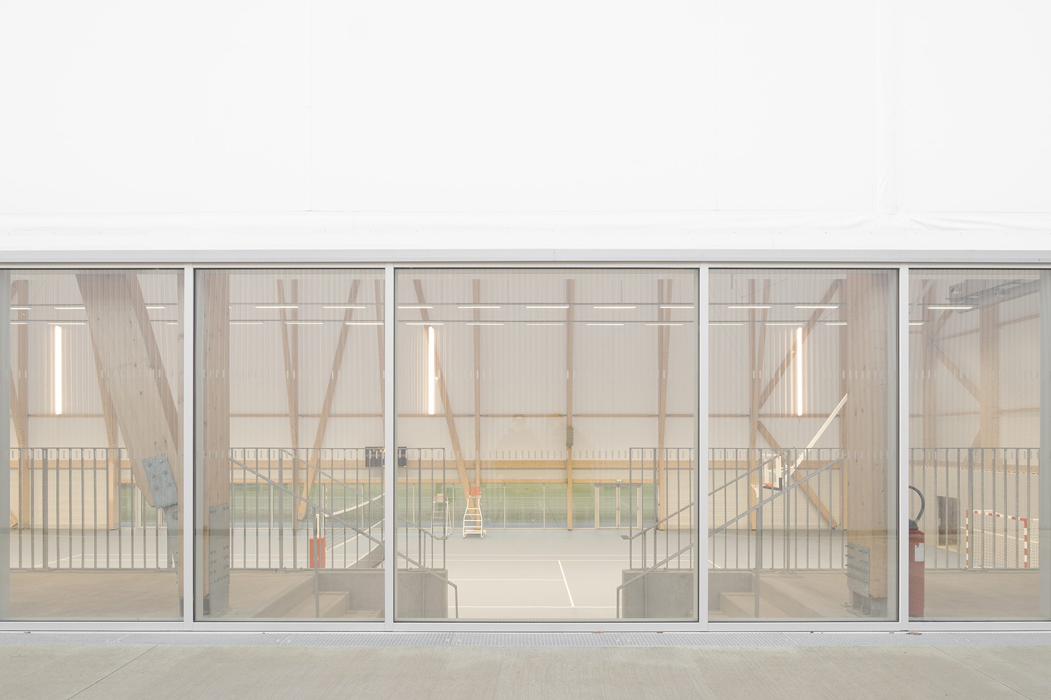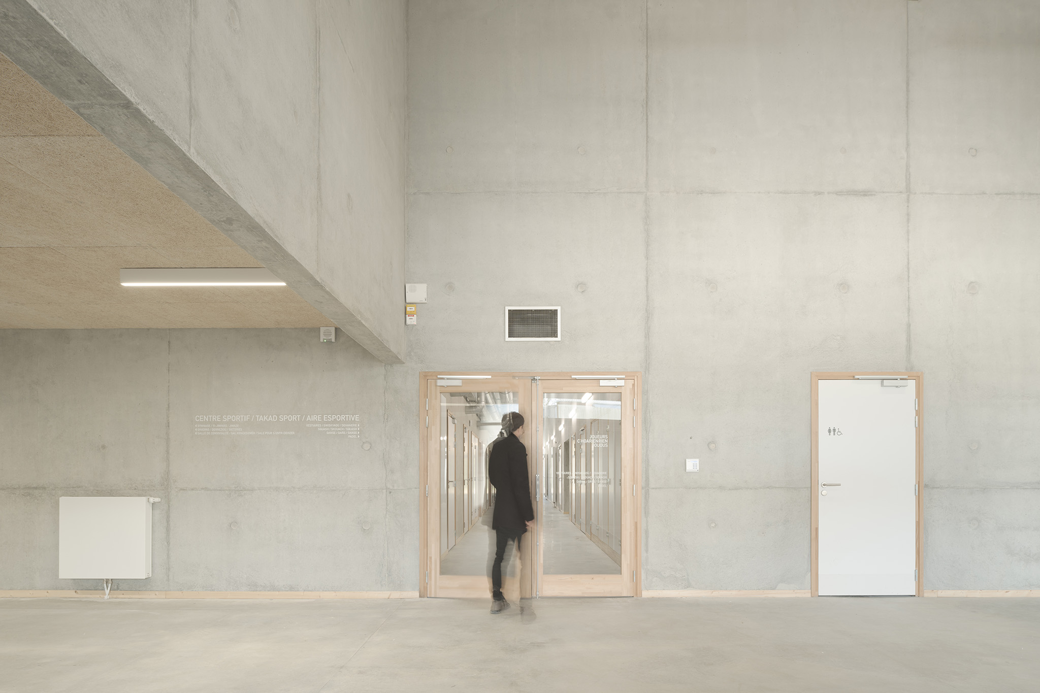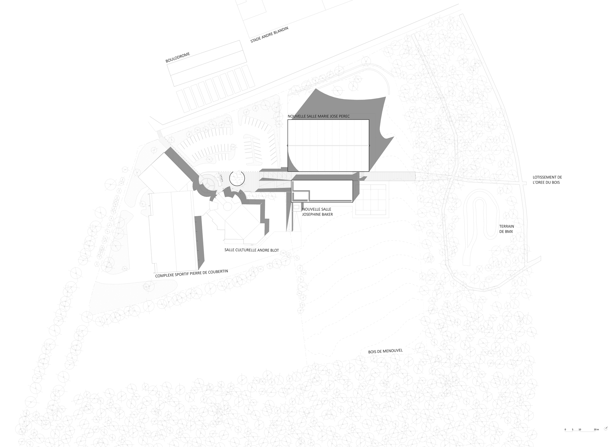 Este nuevo eje, que conectará la urbanización «L'Orée du Bois» y la pista de BMX con las instalaciones existentes y el futuro instituto, atraviesa el nuevo proyecto del pabellón deportivo en dos niveles. En el nivel superior, el paseo cruza el proyecto desde el exterior; en el nivel inferior, un doble acceso desde el paseo proporciona acceso directo al pabellón y a la zona social del complejo.