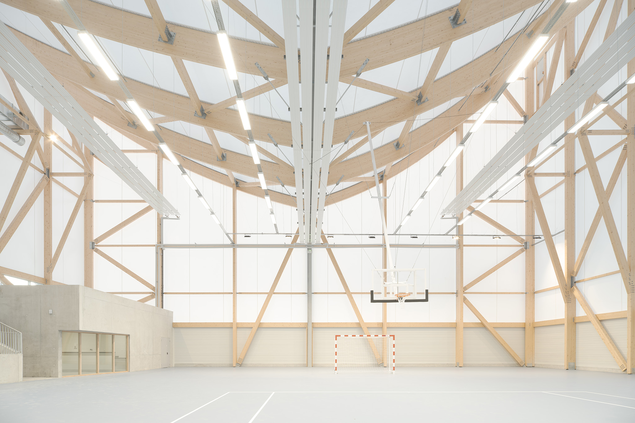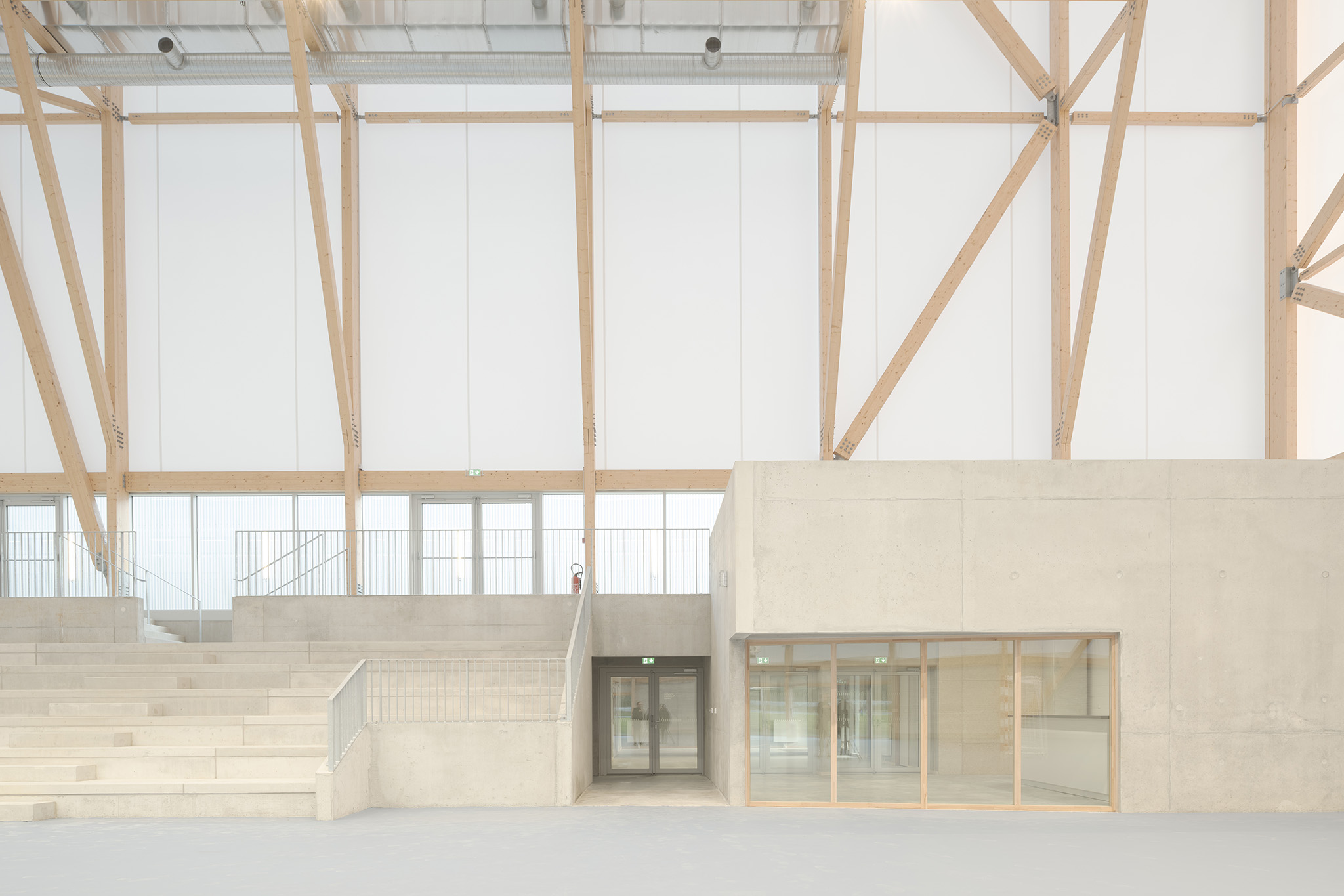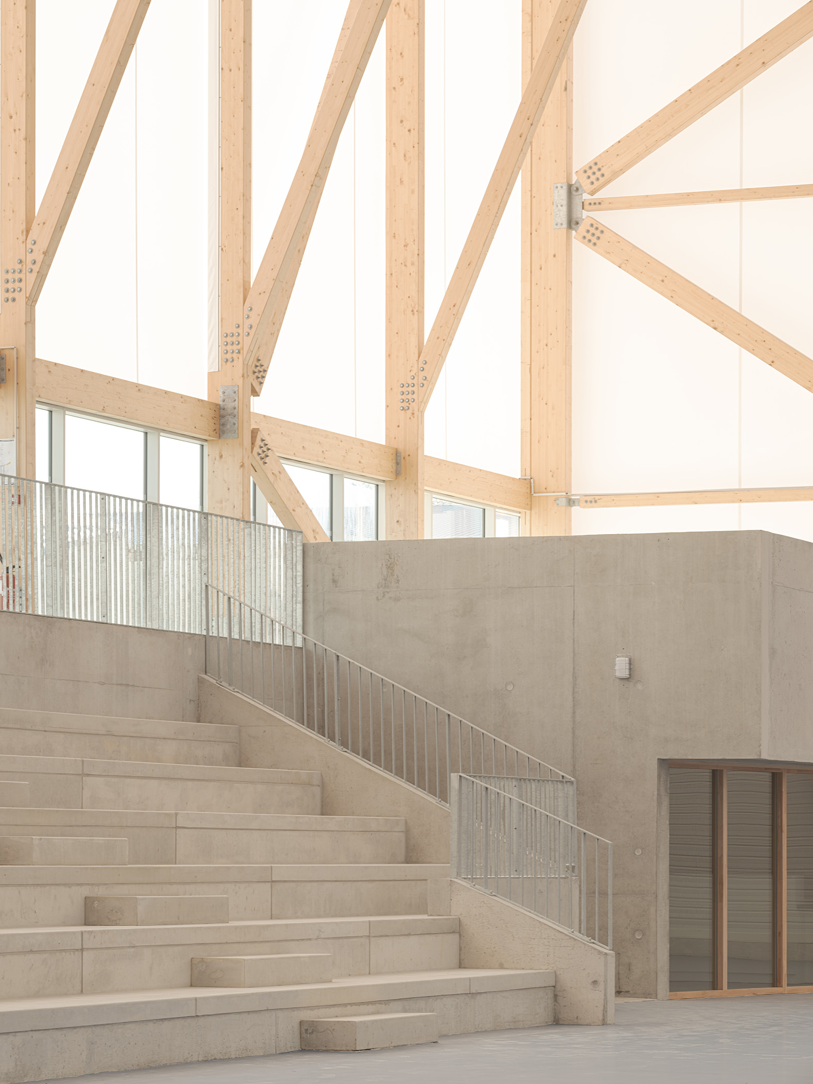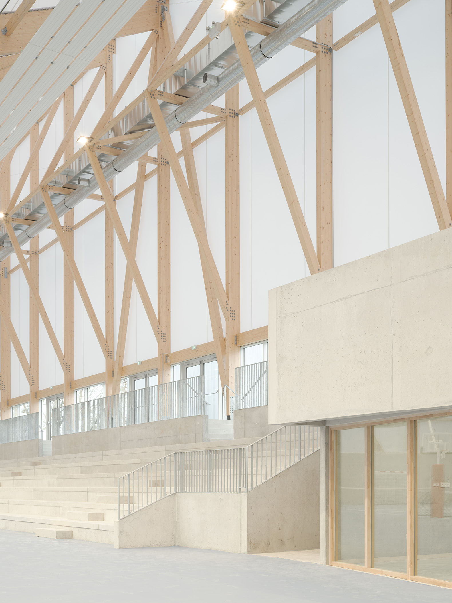 Este nuevo eje, que conectará la urbanización «L'Orée du Bois» y la pista de BMX con las instalaciones existentes y el futuro instituto, atraviesa el nuevo proyecto del pabellón deportivo en dos niveles. En el nivel superior, el paseo cruza el proyecto desde el exterior; en el nivel inferior, un doble acceso desde el paseo proporciona acceso directo al pabellón y a la zona social del complejo.