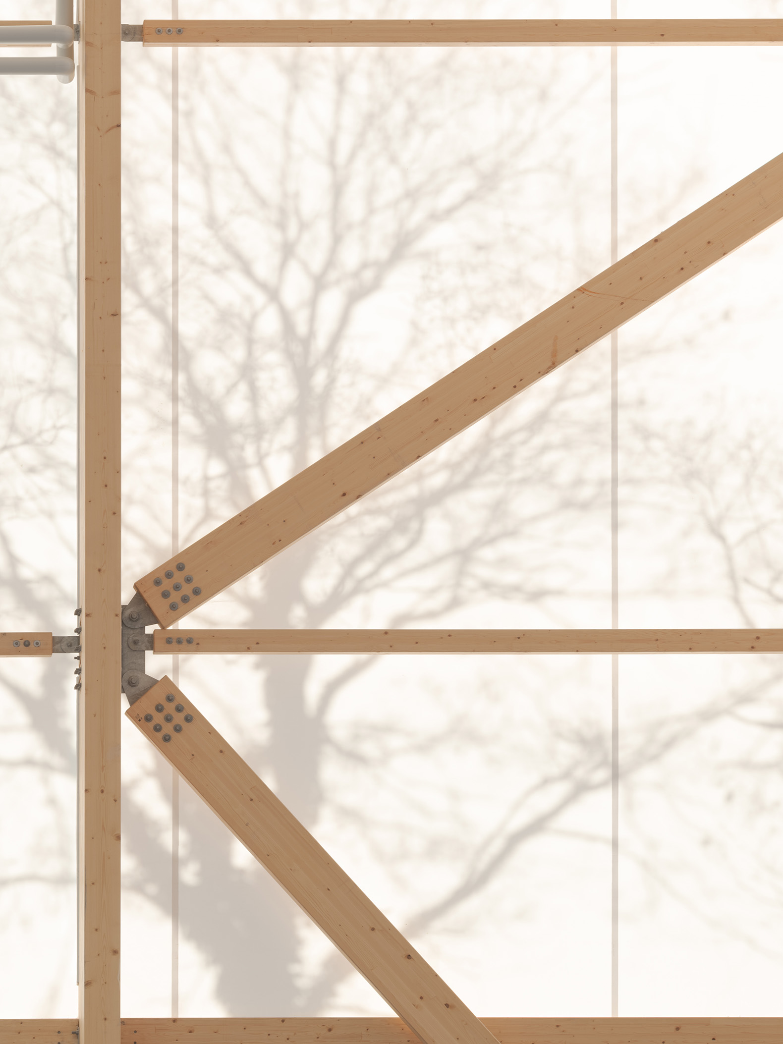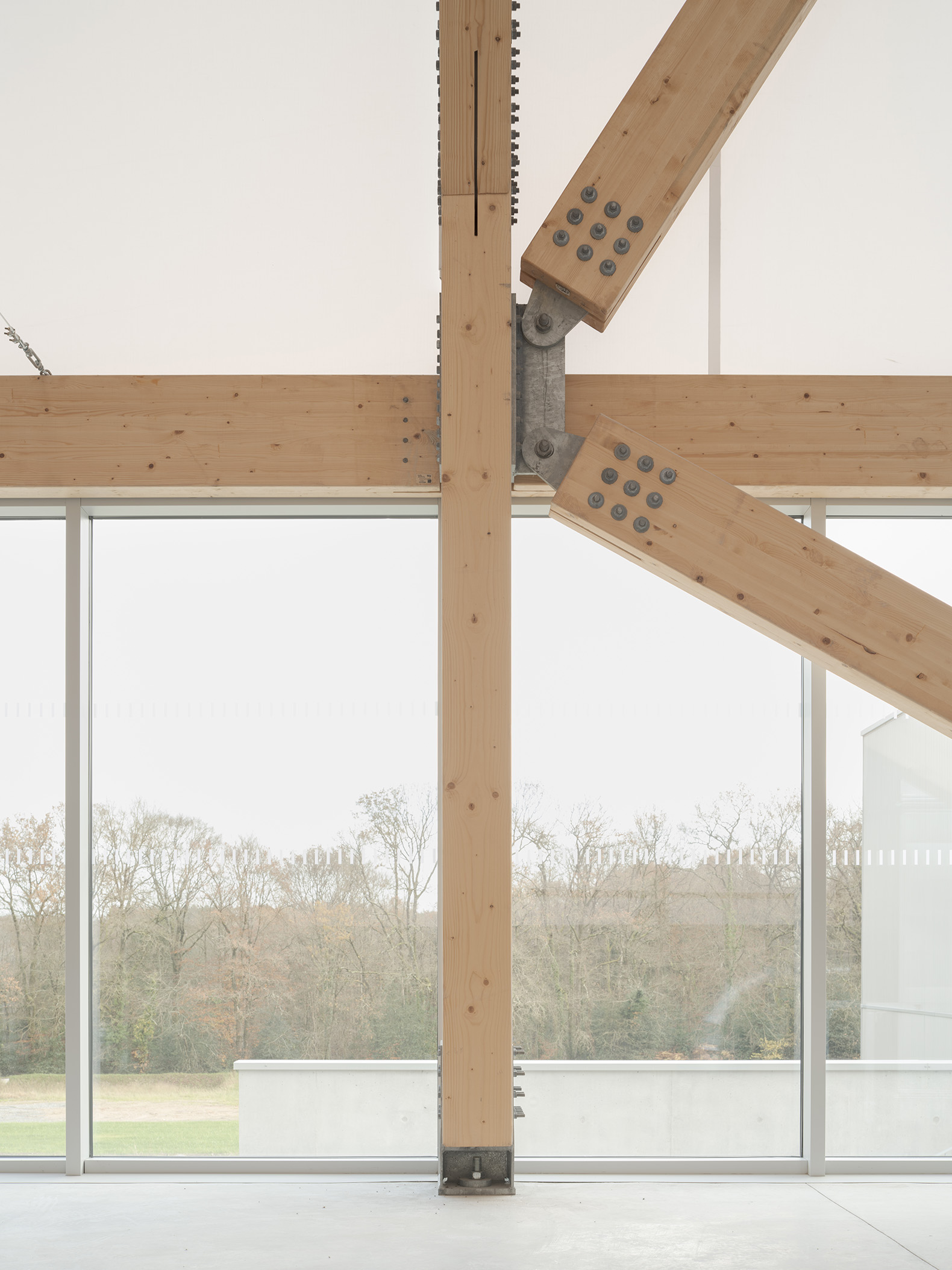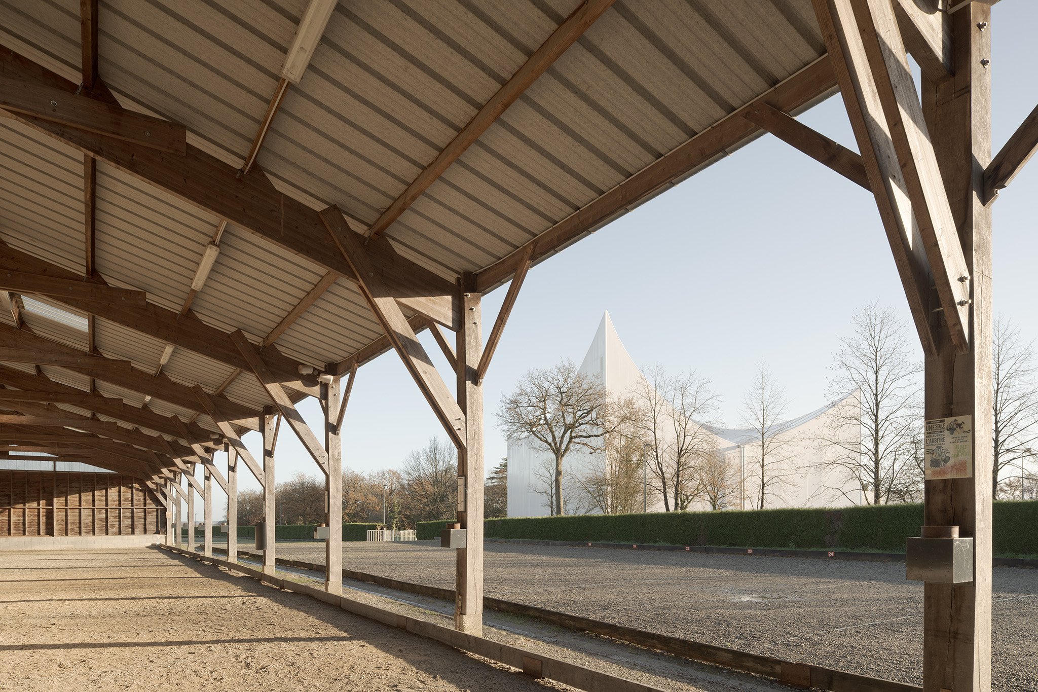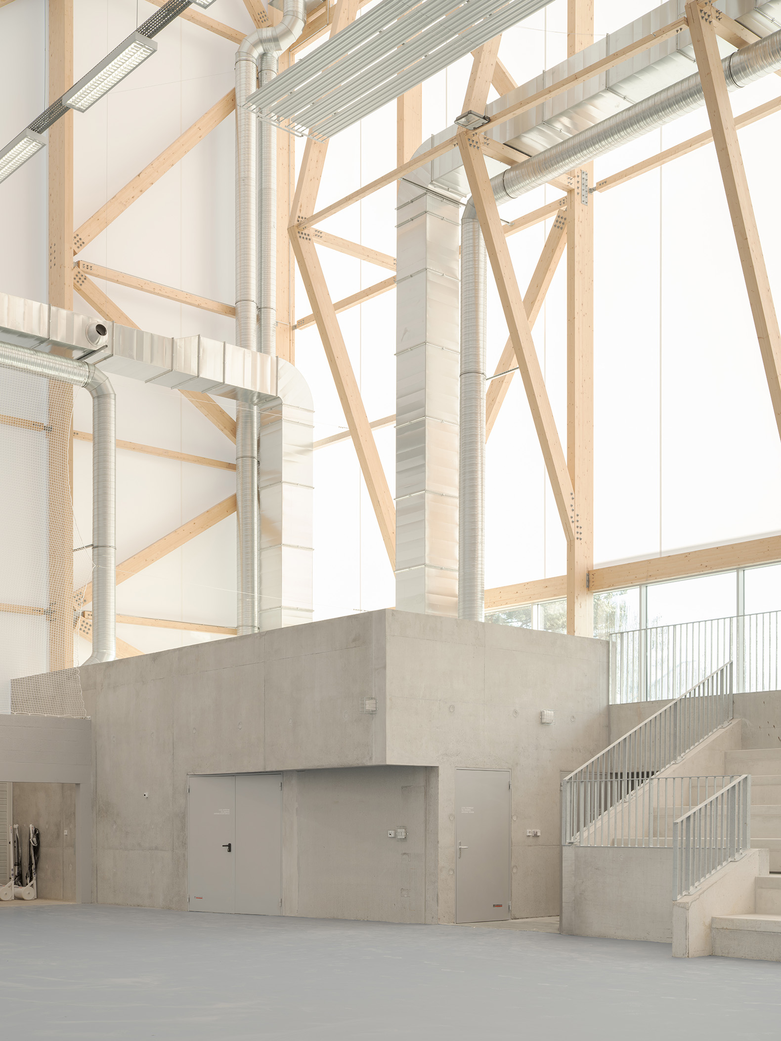 Este nuevo eje, que conectará la urbanización «L'Orée du Bois» y la pista de BMX con las instalaciones existentes y el futuro instituto, atraviesa el nuevo proyecto del pabellón deportivo en dos niveles. En el nivel superior, el paseo cruza el proyecto desde el exterior; en el nivel inferior, un doble acceso desde el paseo proporciona acceso directo al pabellón y a la zona social del complejo.