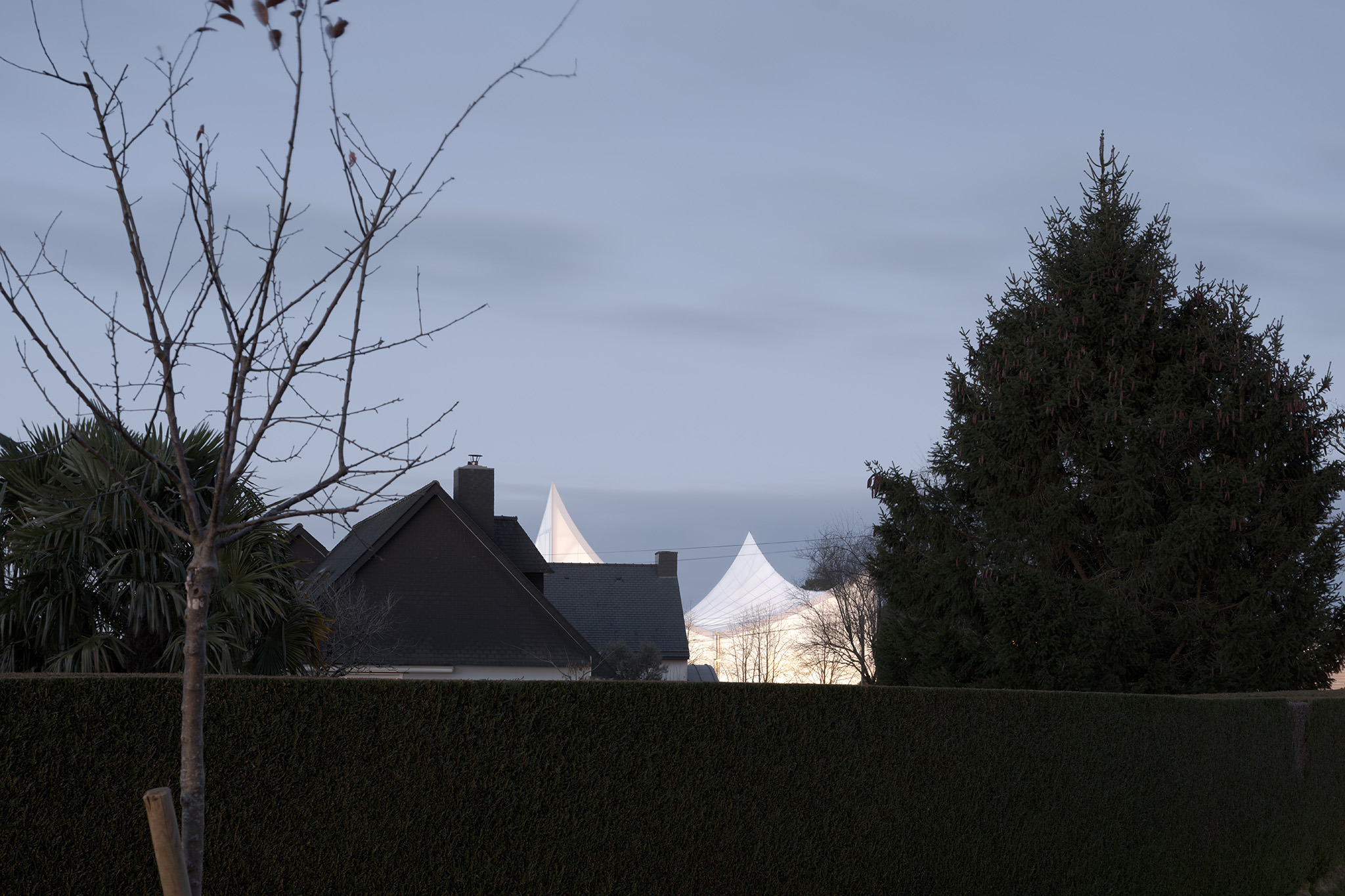 Por la noche, la cubierta y los muros laterales, también de textil blanco, lo transforman en una linterna retroiluminada.
