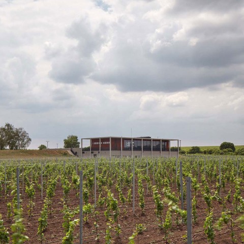 El diseño de la bodega se basa en las tradiciones y referencias similares a las de los edificios románticos del paisaje cultural de Lednice-Valtice. En nuestro caso, fue inspirado por la imagen de un templo clásico, que se transforma en una forma abstracta con una losa apoyada por tres filas de columnas - un pabellón levantado sobre un basamento sólido. Este pabellón complementa suavemente el horizonte verde y los viñedos.