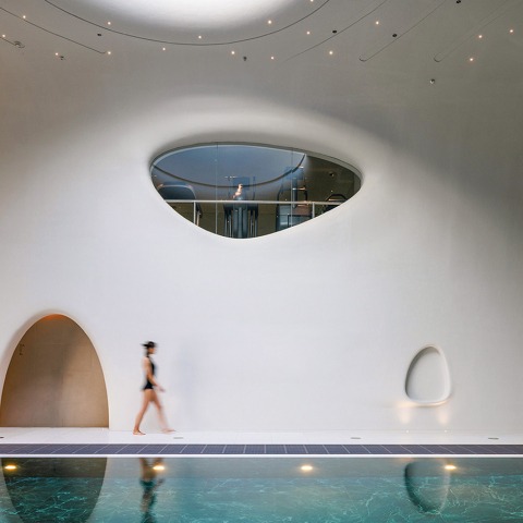 Una vez establecida la forma de la roca, todos los espacios interiores siguieron naturalmente una lógica de excavación—creando un sistema cavernoso que alberga una piscina central, entre otras funciones. Desde hace tiempo me cautiva la imagen de las cuevas llenas de mar en The Beach, de Danny Boyle, y pedí que se abriera un lucernario en la parte superior de The Rock. La luz del día se vierte desde arriba, golpeando el agua hasta convertirla en destellos centelleantes—una santidad efímera, y el momento exacto en que el lugar conmueve.
