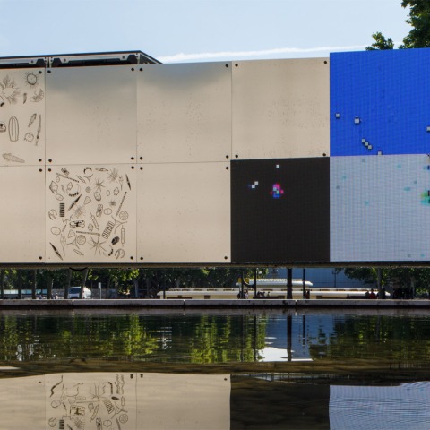 Desde la superficie de la lámina de agua del estanque exterior del Pabellón, una gran pieza visual y sonora nos sumerge hasta las capas más profundas del océano. Lugar poblado por millones de minúsculas criaturas marinas que para alimentarse migran hacia la superficie todas las noches, y que pese a ser desconocido es el mayor ecosistema marino del planeta.