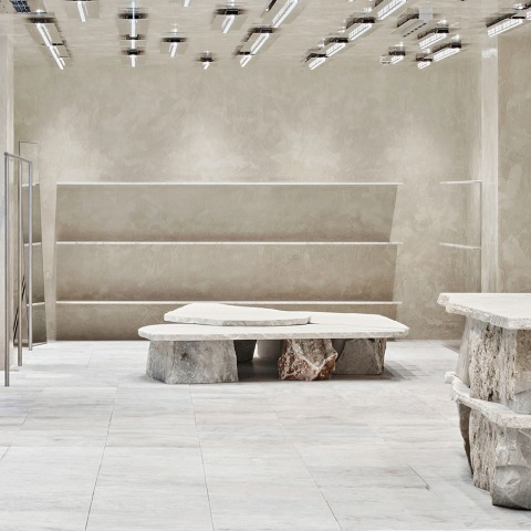 La intervención consiste en tres salas conectadas entre ellas a través de columnas y, donde al final del eje principal, una nueva columnata abstracta crea un nuevo fondo. Esta nueva columnata está hecha de verdadero mármol y genera el acceso a los probadores.