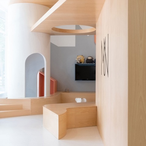 Se ha buscado que arquitectura y mobiliario se encuentren en un equilibrio perfecto. Los espacios de servicio y maquinaria se ocultan tras puertas integradas y ocultas a través de un panelado de madera que envuelve la ameba central generando una piel continua. El mobiliario y arquitectura se adaptan a las diferentes escalas de adultos y niños, generando un espacio fenomenológico que se vive en tres dimensiones.