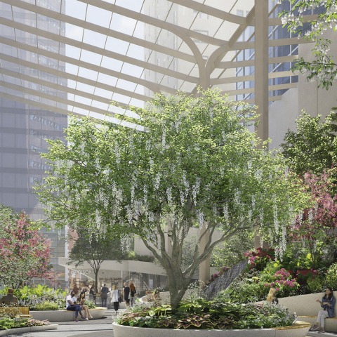 El nuevo jardín abrirá el espacio público a lo largo del extremo oeste de la torre, transformándolo en una serie de "salas" interconectadas al aire libre que brindan espacios tranquilos y áreas más grandes y más abiertas. Parcialmente cubierta por un nuevo dosel de vidrio y formada por una serie de círculos que se cruzan en planta, la geometría de estas salas se inspira en el uso juguetón de motivos circulares de Philip Johnson tanto en 550 Madison como en su cuerpo de trabajo más grande. Estas salas circulares invitan a los transeúntes a detenerse mientras deambulan, permitiendo que el jardín acomode una variedad de experiencias para sus visitantes: reunirse durante el almuerzo y socializar, encontrar un respiro junto a la fuente de agua o experimentar una conexión táctil con la naturaleza. Conceptualmente, el paisaje responde a la verticalidad en forma de cañón del centro de Manhattan, con una topografía verde en capas que se eleva a lo largo del lado oeste del jardín, minimizando el impacto de la infraestructura de servicio de la torre existente y al mismo tiempo que da la sensación de estar inmerso en el jardín.