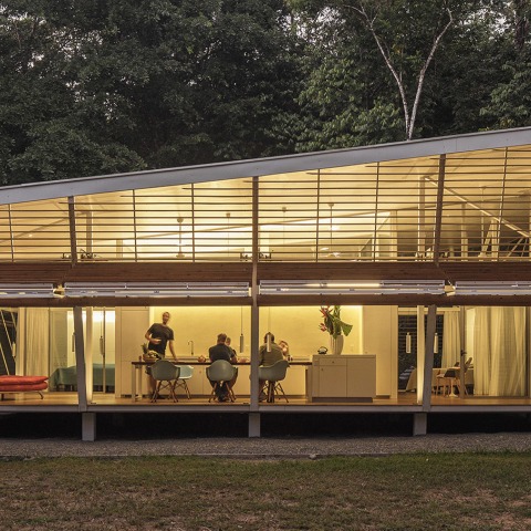 La compresión de utilidades en una unidad compacta permite un plan libre a su alrededor. Además, contribuye a la economía de la casa en términos de montaje y mantenimiento. Piezas de mobiliario adicionales se colocan en la envoltura de doble capa del edificio, que se crea por las columnas estructurales verticales y las fachadas exteriores inclinadas. La inclinación responde a la luz solar entrante en las horas más calurosas del día. Los paneles de fachada pueden abrirse o cerrarse individualmente para regular vistas y exposición, aumentar o reducir los flujos de aire, crear privacidad y seguridad. Convierten espacios interiores a exteriores y juegan con la dinámica interior-exterior de la arquitectura tropical.