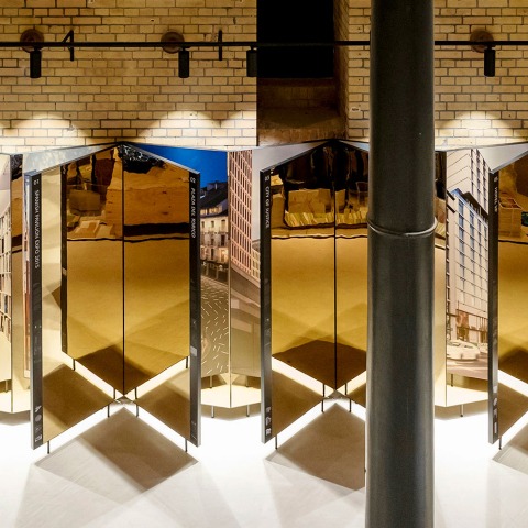 Alrededor de este “mercado” se han dispuesto sobre paneles plegados, fragmentos de cada uno de los proyectos. Estos soportes han heredado la materialidad de la obra Encants Barcelona y presentan un elevado grado de reflexión sobre el fondo de color dorado tan característico de la cubierta icónica del “Mercat”.