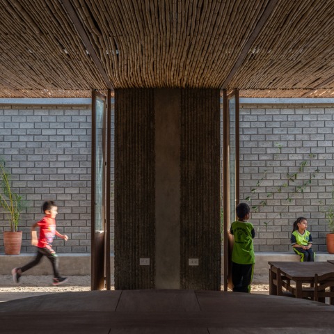 La respuesta constructiva nace de la comunidad que entiende su entorno como valioso. El denominador común entre las construcciones es la utilización de los materiales sin revestimiento, por economía. Así que lo adoptamos como concepto. Potenciamos los materiales tal y como son; ladrillo visto, concreto visto, estera, caña brava y madera. Esto supone un ahorro importante, sin dejar de poner en valor el edificio. La sinceridad del material ayuda a que la propia comunidad pueda sentirse identificada con la escuela y dignificar los métodos constructivos locales.