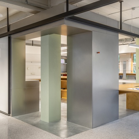 El núcleo creativo está diseñado meticulosamente para equilibrar la flexibilidad y la funcionalidad. Durante las primeras etapas de planificación, Shang Interior Architects exploró dos configuraciones principales: una caja tridimensional transparente y un sistema de tabiques deslizantes de pizarra que encierran el núcleo. El diseño final combina elementos de ambos, incorporando paredes de metal adaptables y superficies magnéticas para colocar materiales, junto con sistemas de pizarras suspendidas que facilitan la ideación y la exhibición instantáneas.
