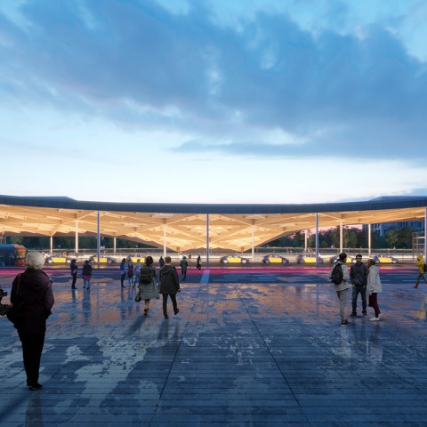 Los extremos de la pérgola se elevan marcando los accesos a la estación. Aun siendo fácilmente identificable en su escala de infraestructura, su altura hace de ella un elemento integrado en la escala del entorno urbano. La propuesta remarca la identidad de la nueva infraestructura desde la ciudad, maximizando su visibilidad y manteniendo la escala de barrio,