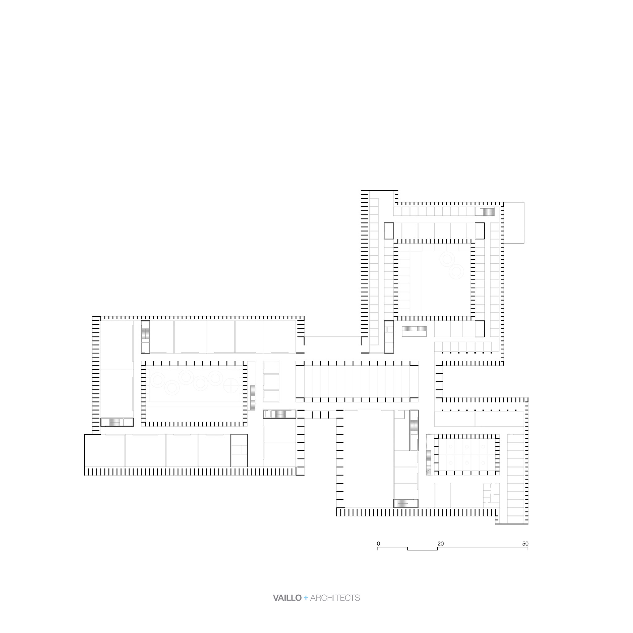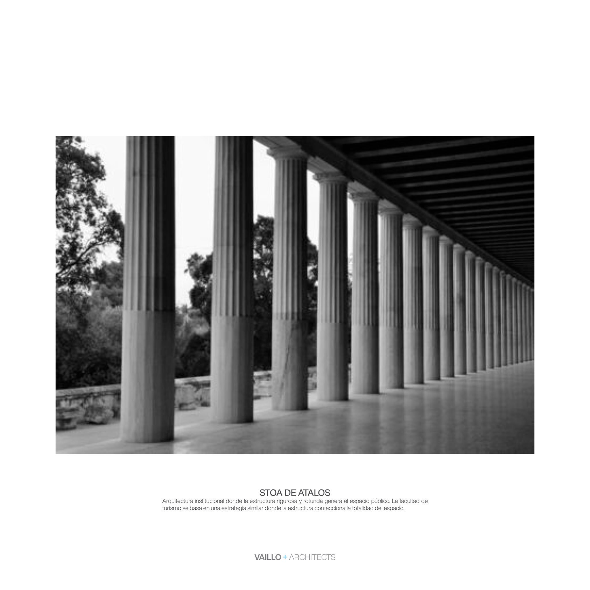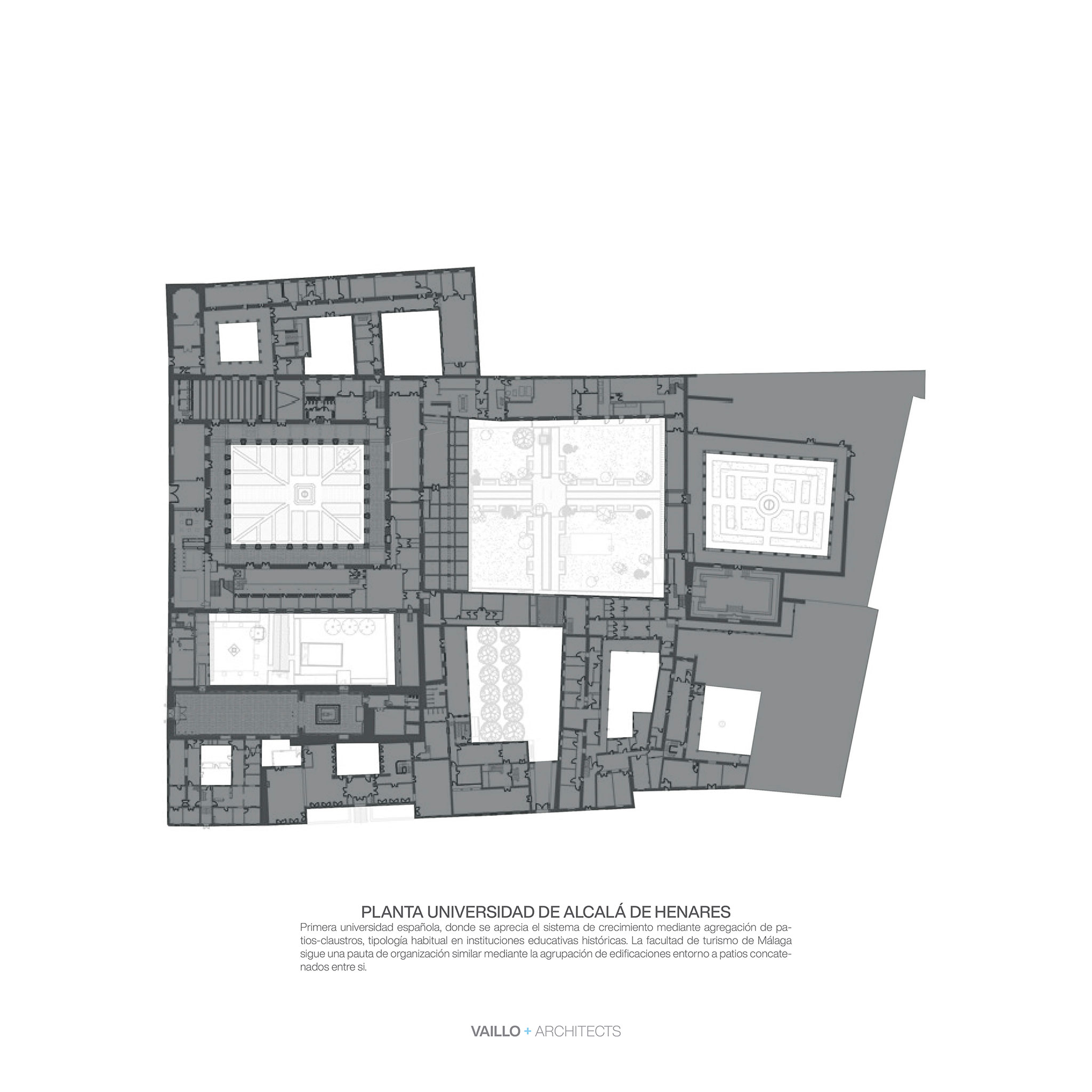 La propuesta programática de Vaillo +Architects para la Facultad de Turismo funciona como una pequeña ciudad universitaria, fragmentando el espacio en tres volúmenes principales. Cada uno cuenta con un claustro interno propio y se conecta a través del atrio mediante plataformas y jardines. El primer volumen se dedica al «Culinary Center», con aulas y laboratorios para la innovación gastronómica; el segundo alberga la administración y los despachos departamentales; y el tercero funciona como centro social, con salón de actos, biblioteca, cafetería y decanato.