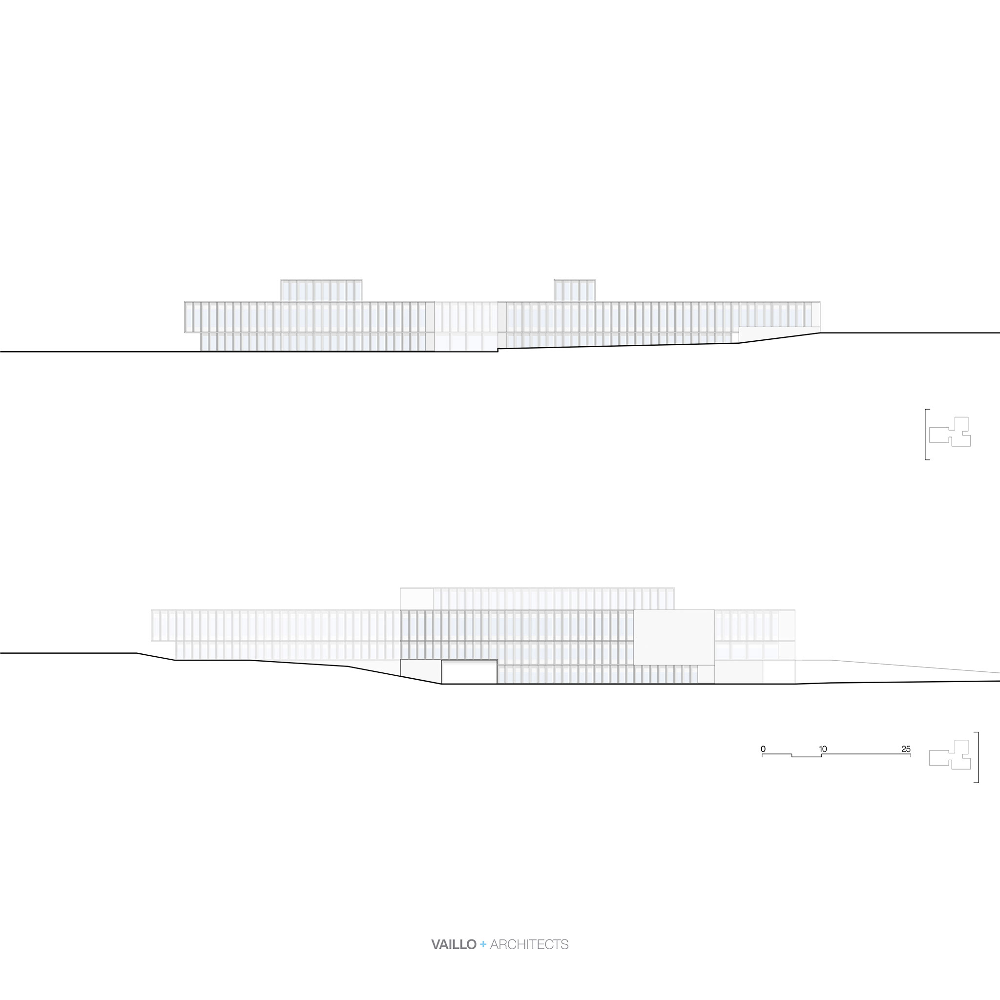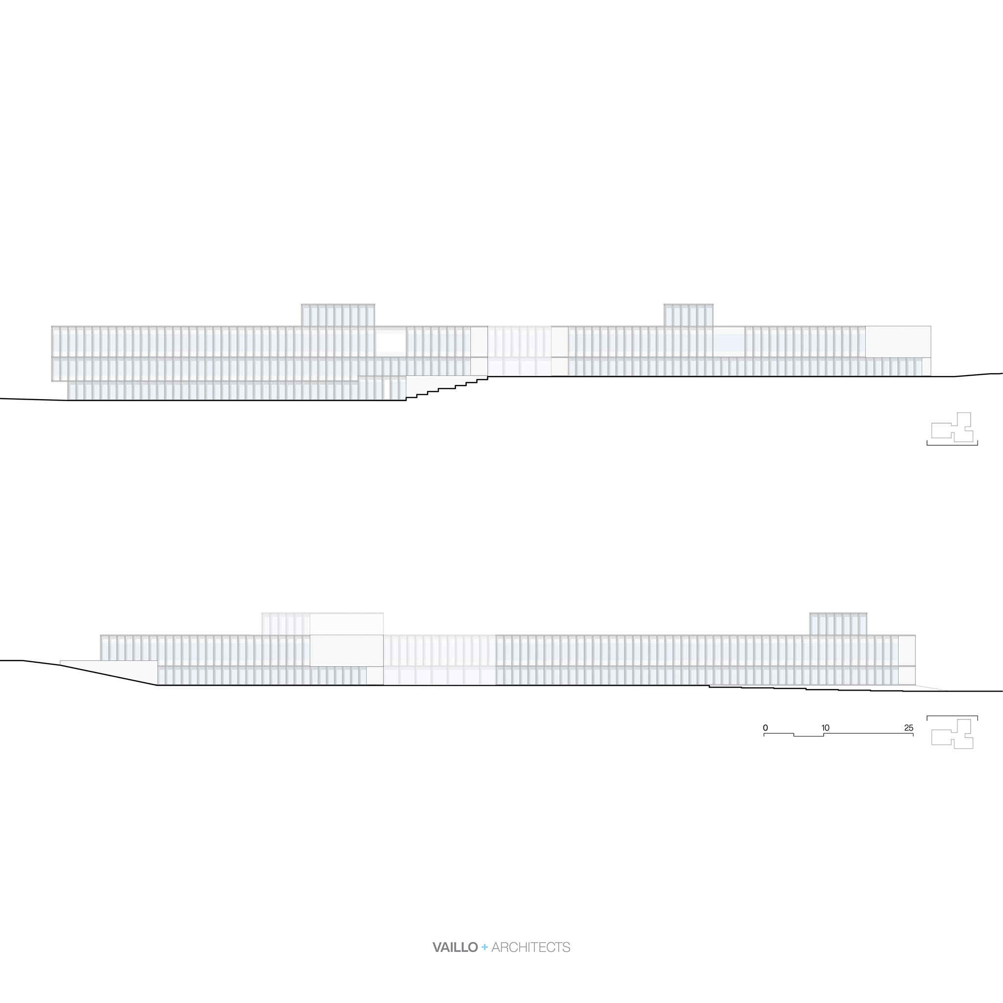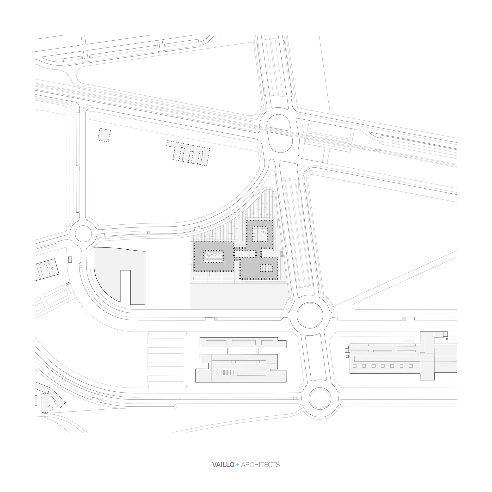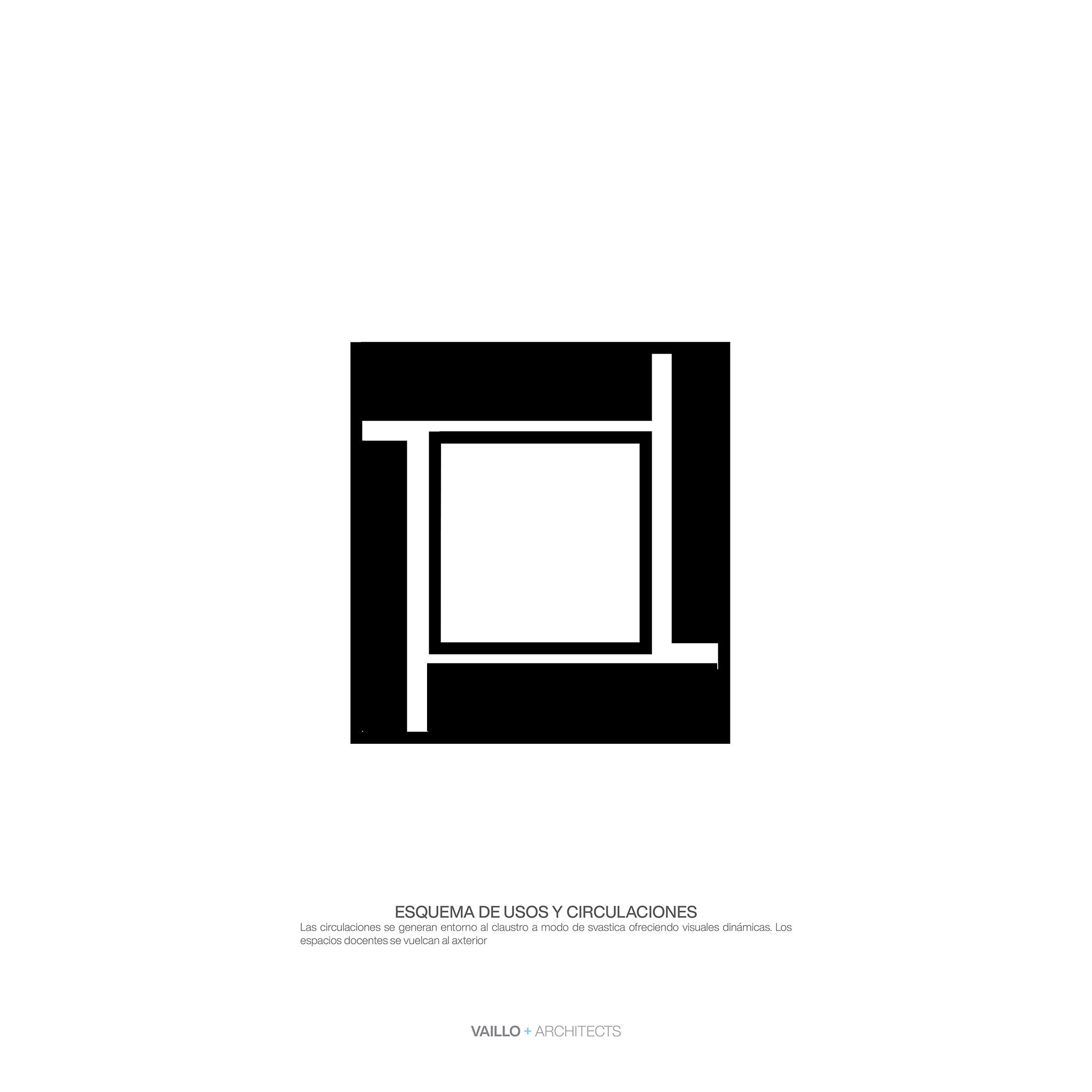 La propuesta programática de Vaillo +Architects para la Facultad de Turismo funciona como una pequeña ciudad universitaria, fragmentando el espacio en tres volúmenes principales. Cada uno cuenta con un claustro interno propio y se conecta a través del atrio mediante plataformas y jardines. El primer volumen se dedica al «Culinary Center», con aulas y laboratorios para la innovación gastronómica; el segundo alberga la administración y los despachos departamentales; y el tercero funciona como centro social, con salón de actos, biblioteca, cafetería y decanato.