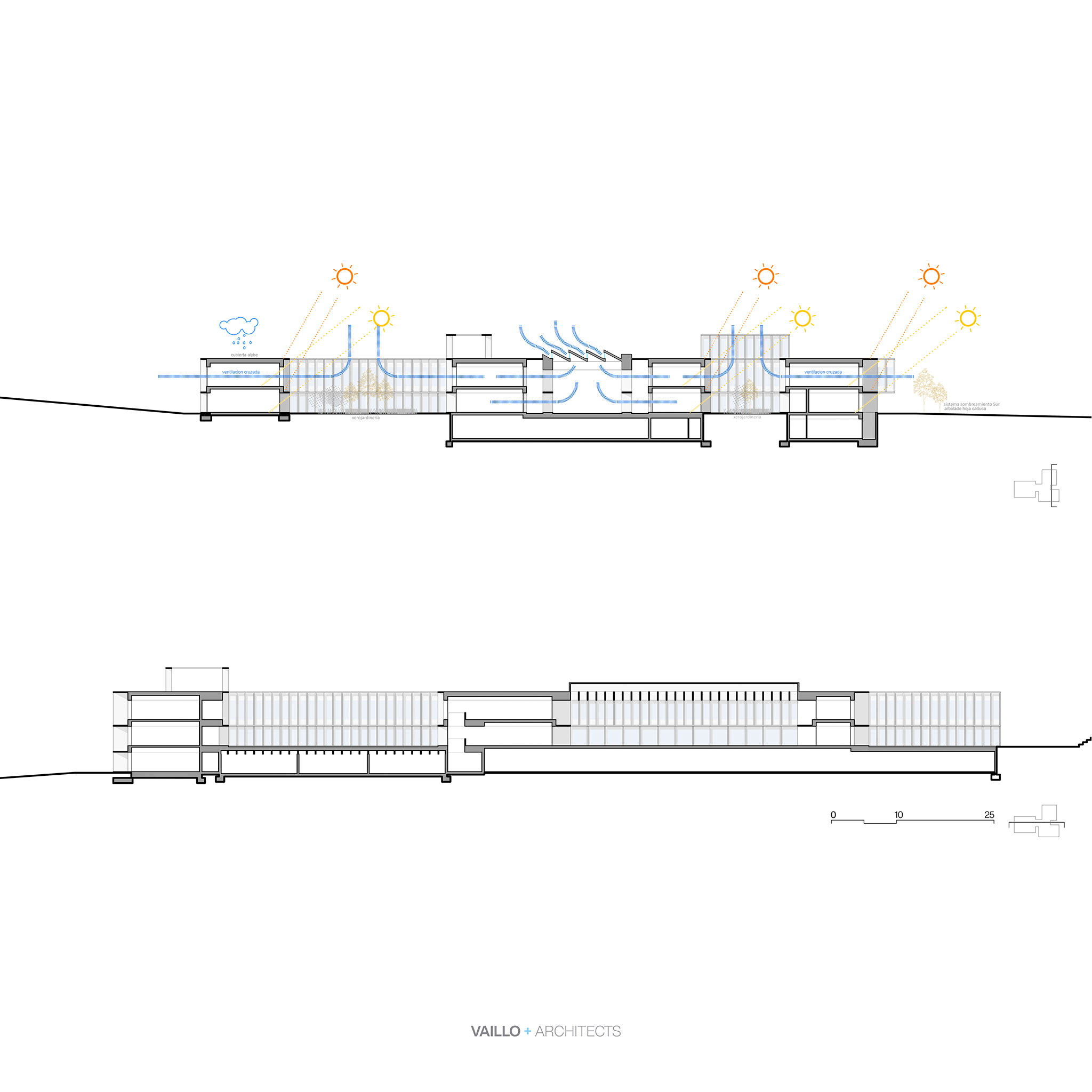 A nivel constructivo, el edificio está conformado por una estructura que es la esencia estética y ética del proyecto, donde el hormigón visto define tanto el interior como el exterior. Este sistema estructural se ejecuta perimetralmente mediante pantallas y vigas de gran canto, liberando la planta, flexibilizando el espacio y funcionando como celosía que protege de la incidencia solar.
