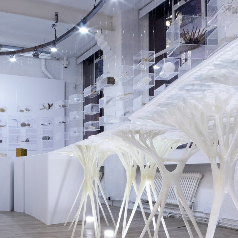 Showcasing ’s working philosophy and embracing 3D printing’s capacity for radically increased resource efficiency, the exhibition’s central installation takes the form of a long sweeping display designed to showcase innovative SKO software – a structural optimisation computer programme based on the adaptive growth patterns of trees and bones – and has been created with support from large-scale 3D printing pioneer