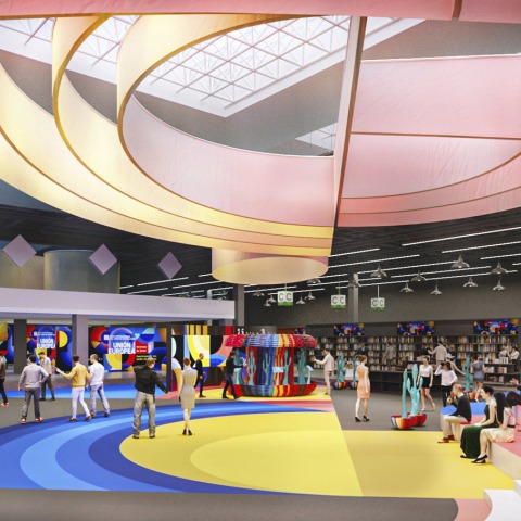 Las formas geométricas y los colores primarios, utilizados estratégicamente para diferenciar la funcionalidad de cada espacio, combinan colores vibrantes que realzan los espacios principales de encuentro con colores tenues para definir las zonas de lectura y descanso. A su vez el lenguaje cromático implementado consigue dotar de unidad al extenso espacio y actúa como guía intuitiva para dirigir a los visitantes a través del recorrido expositivo.
