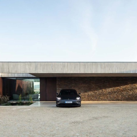 En cuanto a la materialidad, asociamos materias primas y naturales que se fusionarían con el entorno. Partimos de hormigón, piedra, madera y acero. En el exterior, el hormigón visto se fusiona sutilmente con la pizarra natural y el acero corten oxidado por el tiempo.