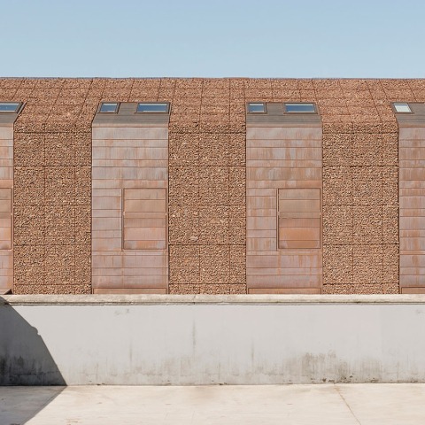El material triturado es contenido en un espesor de unos pocos centímetros, mediante una red metálica de acero Corten y uniformemente distribuida por la cubierta y las paredes, constituyendo una especie de "legado" estético y constructivo, a pesar de la transformación a la que se se sometió.