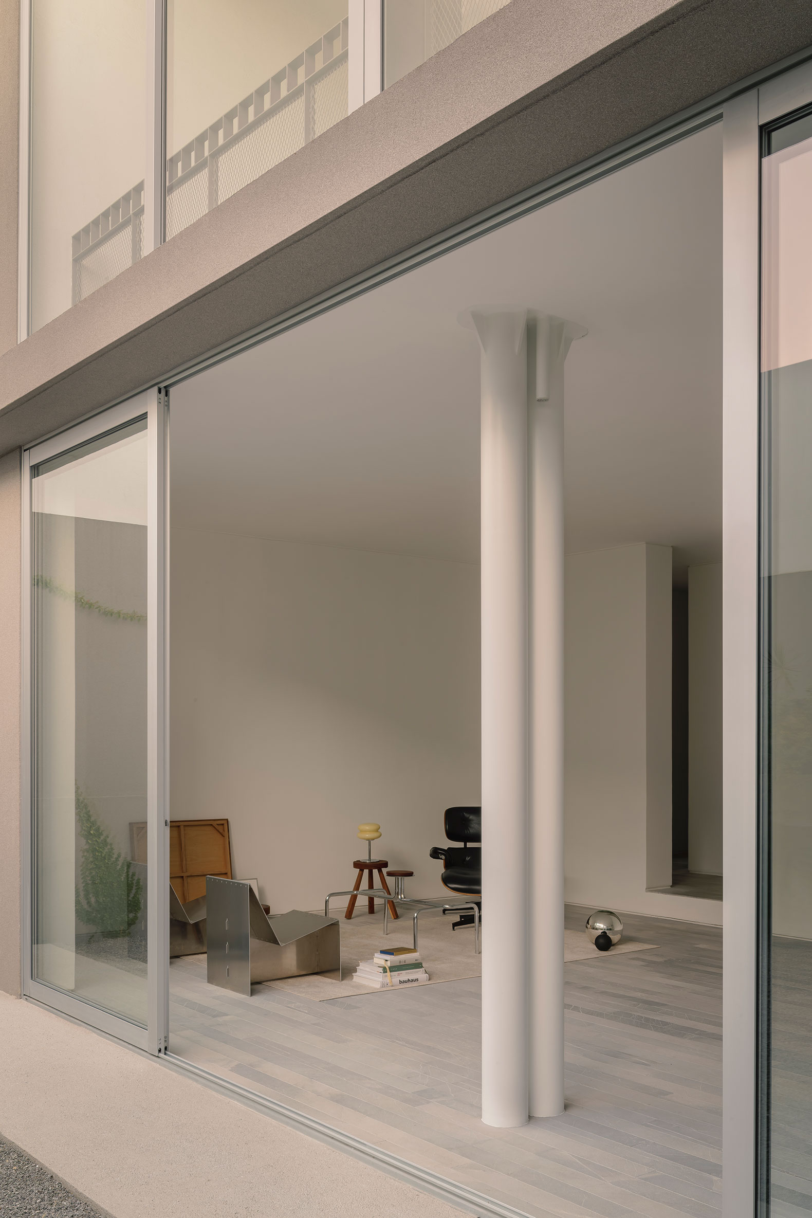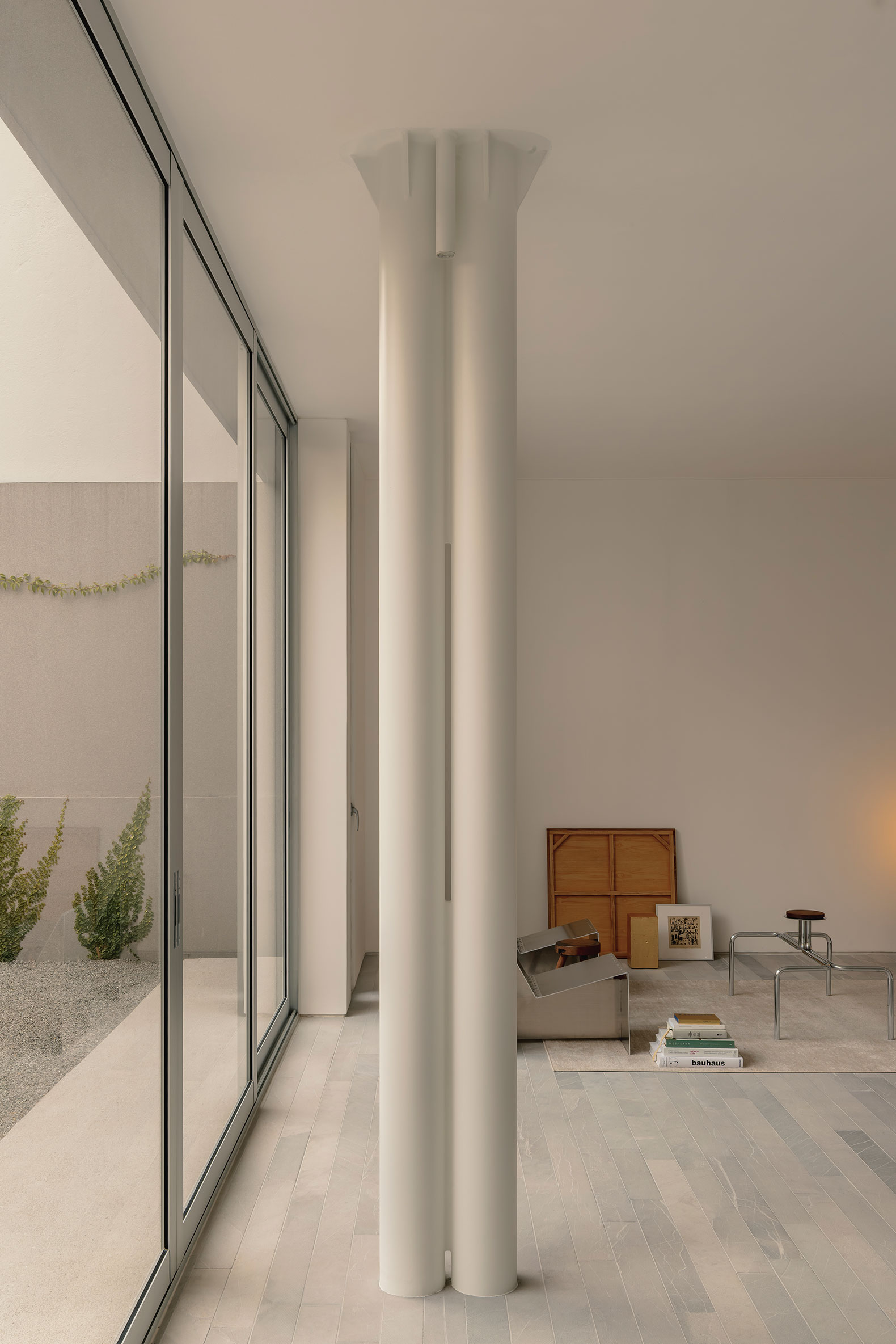 La estructura se organiza con una trama de cuatro ejes, complementada en tres lados con soportes metálicos dobles que facilitan grandes aperturas. Las losas voladizas funcionan como umbrales de protección solar y mecanismos de captación pluvial.