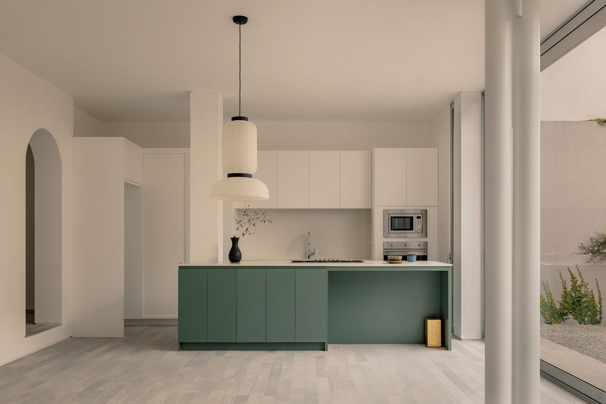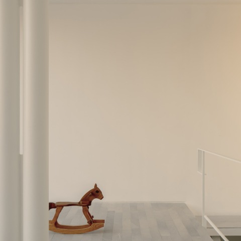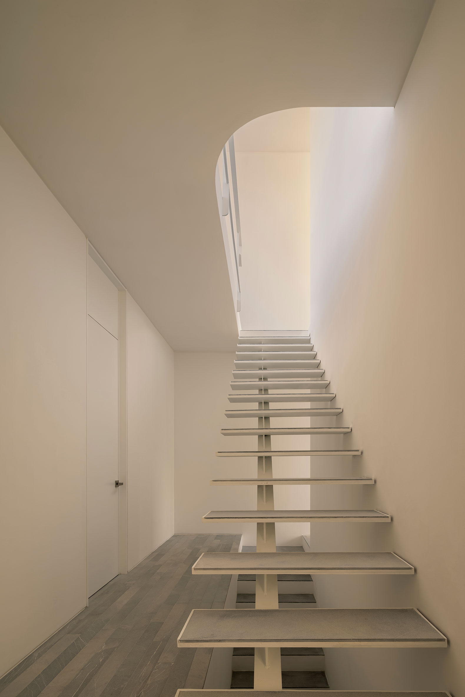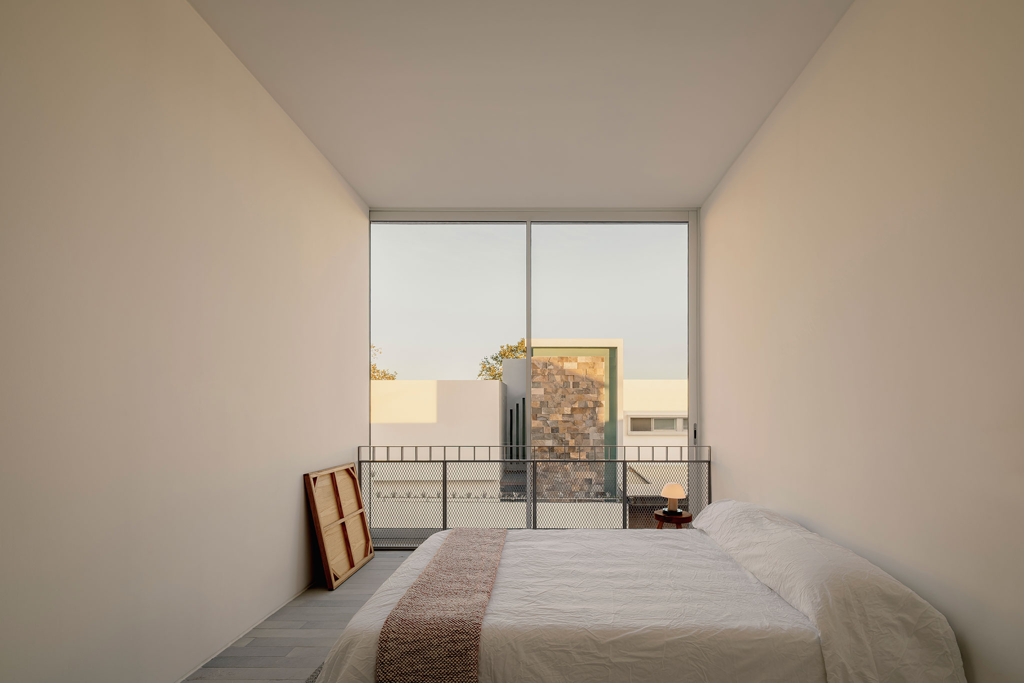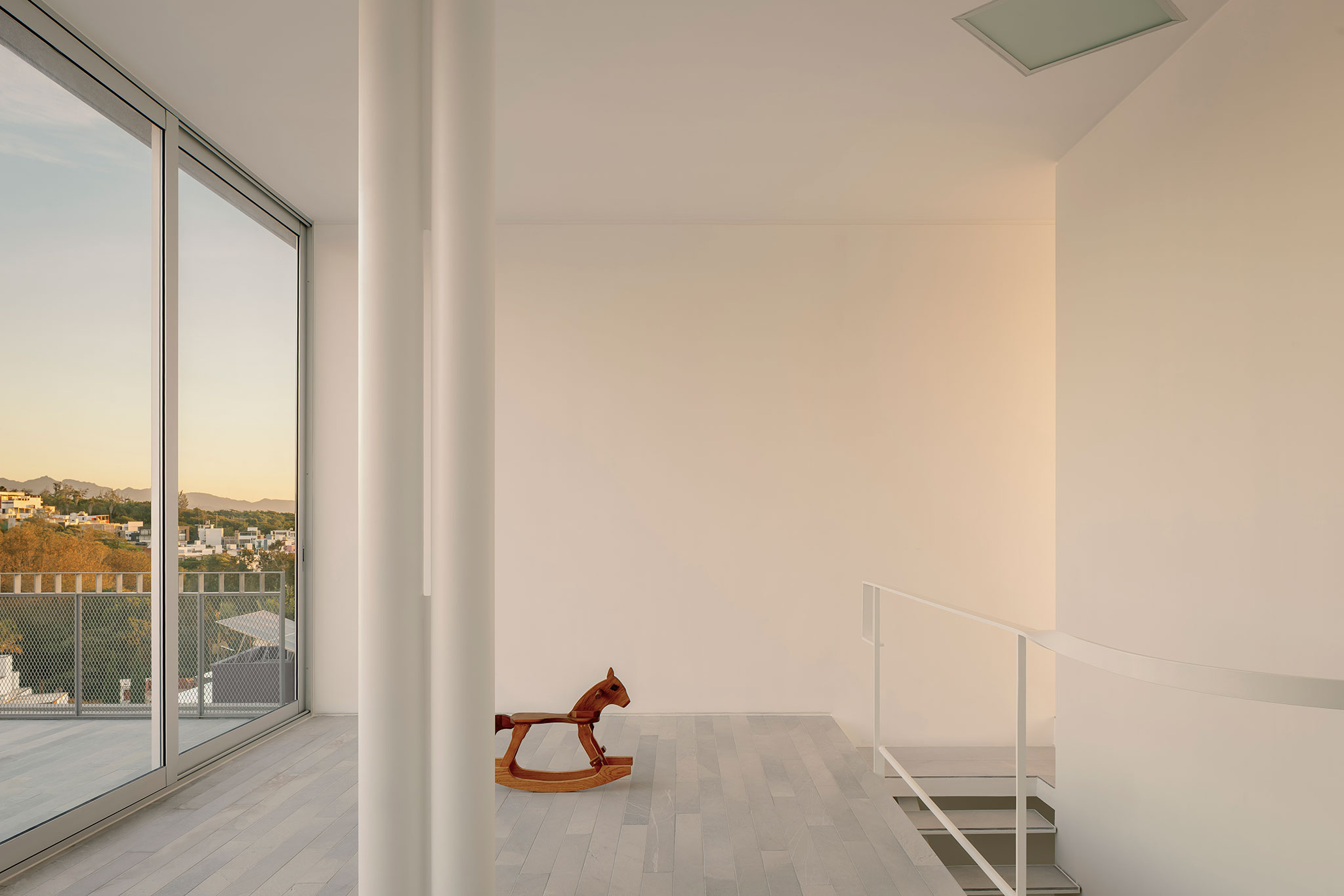 Ascendiendo, el primer nivel se despliega en una planta de impronta cruciforme; geometría que organiza el espacio con la nitidez de un axioma. Tres recintos se disponen alrededor del eje vertical como brazos en equilibrio: al frente, la recámara principal se proyecta hacia el paisaje urbano, mientras las secundarias se extienden lateralmente, de manera autónoma, hacia el jardín. Este esquema garantiza la privacidad dentro de un sistema mayor; una arquitectura contenida que respira. Los interiores, blanco absoluto, parecen detener el ciclo. Habitar cada espacio es como detenerse frente a un cuadro. El mundo exterior es aquí una pintura que invita a observar, a recordar los días que han pasado y a imaginar los días que vendrán.