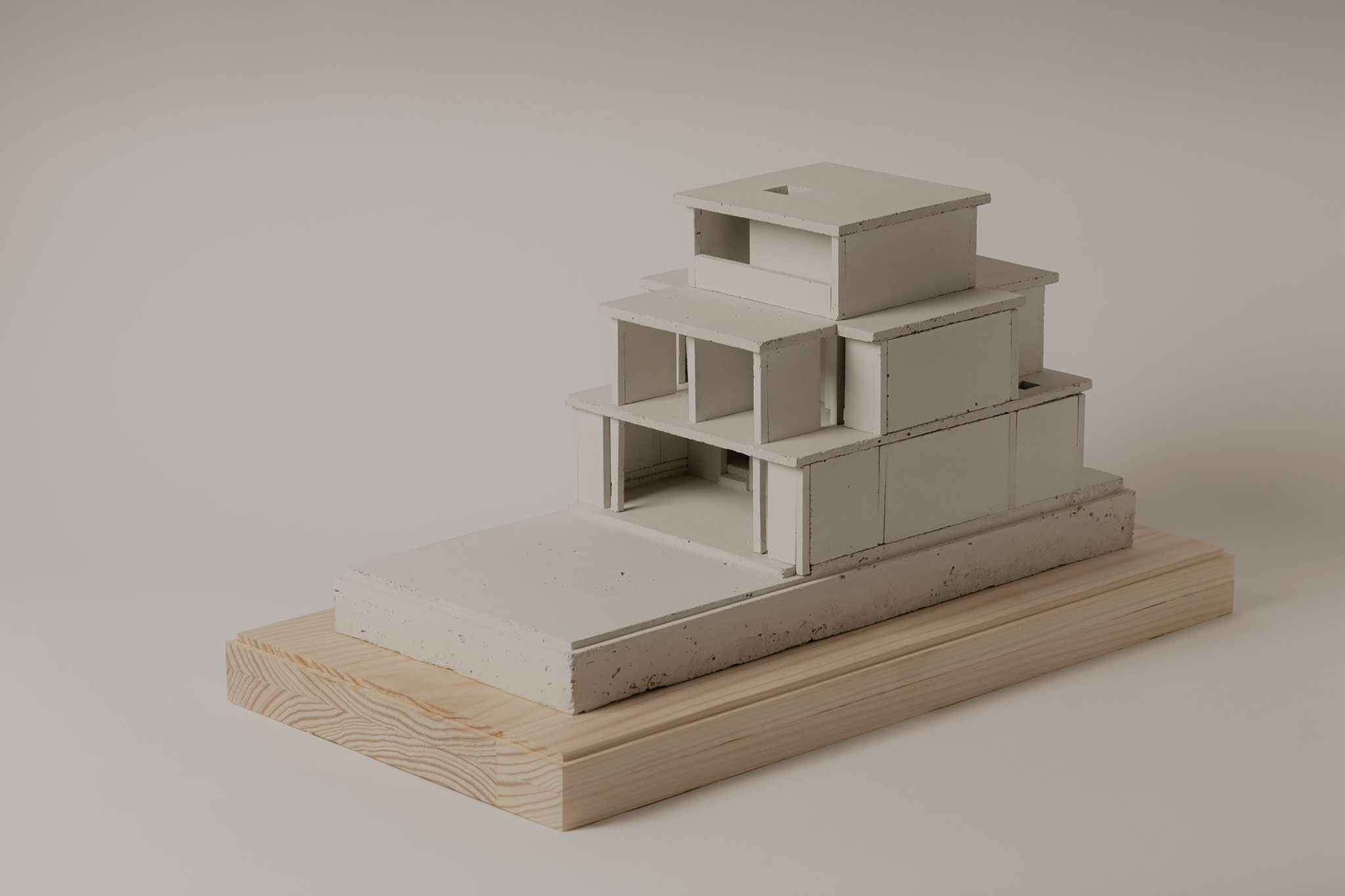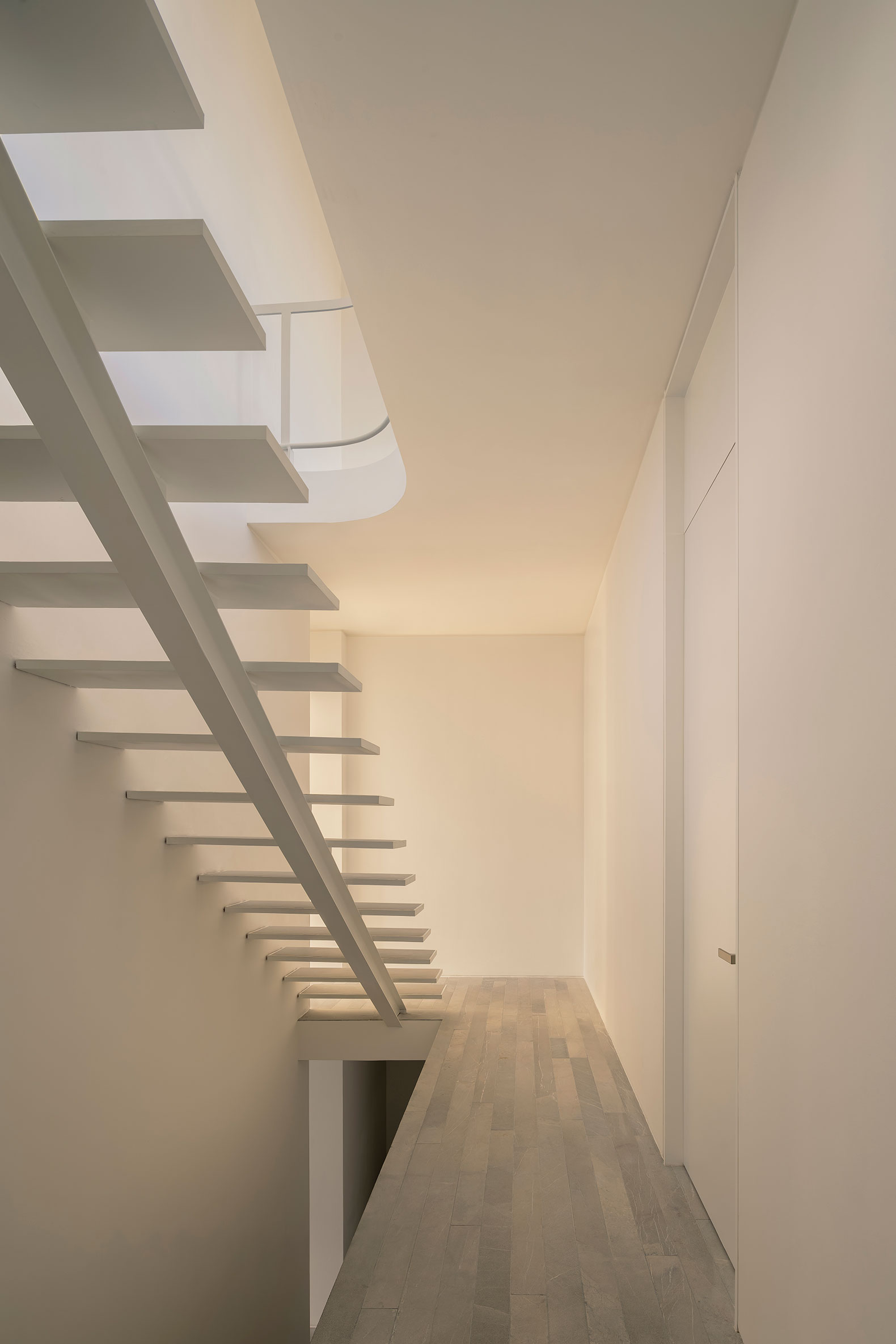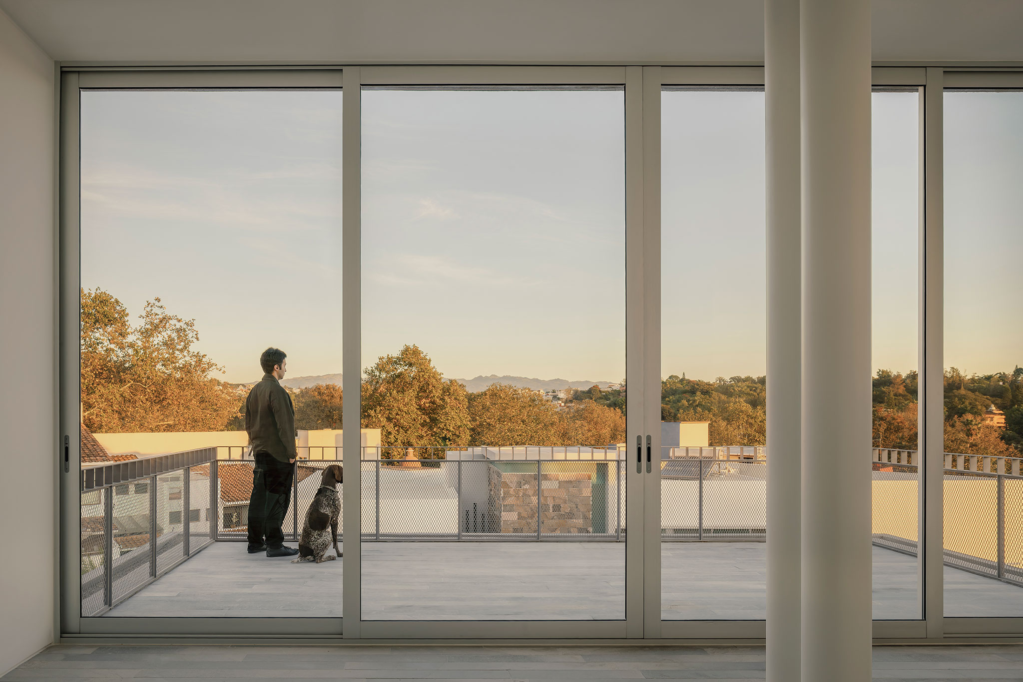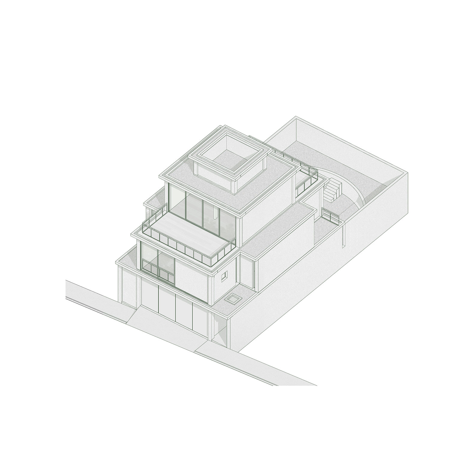 El nivel superior se retranquea, aprovechando su posición elevada para abrirse al paisaje mediante amplias terrazas que permiten vistas sobre las construcciones vecinas. La casa se completa con un volumen técnico y austero.