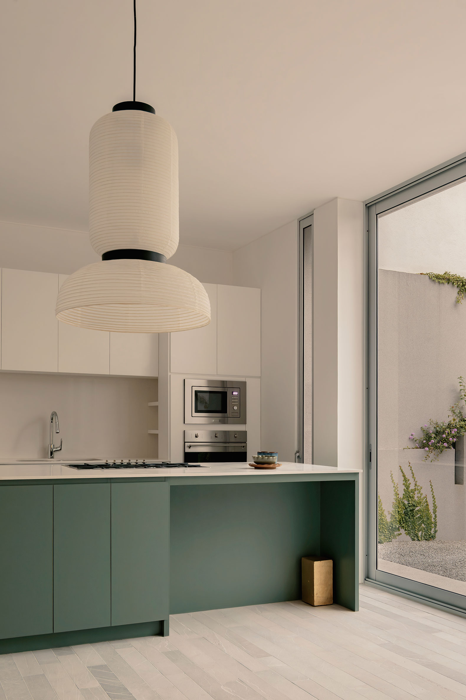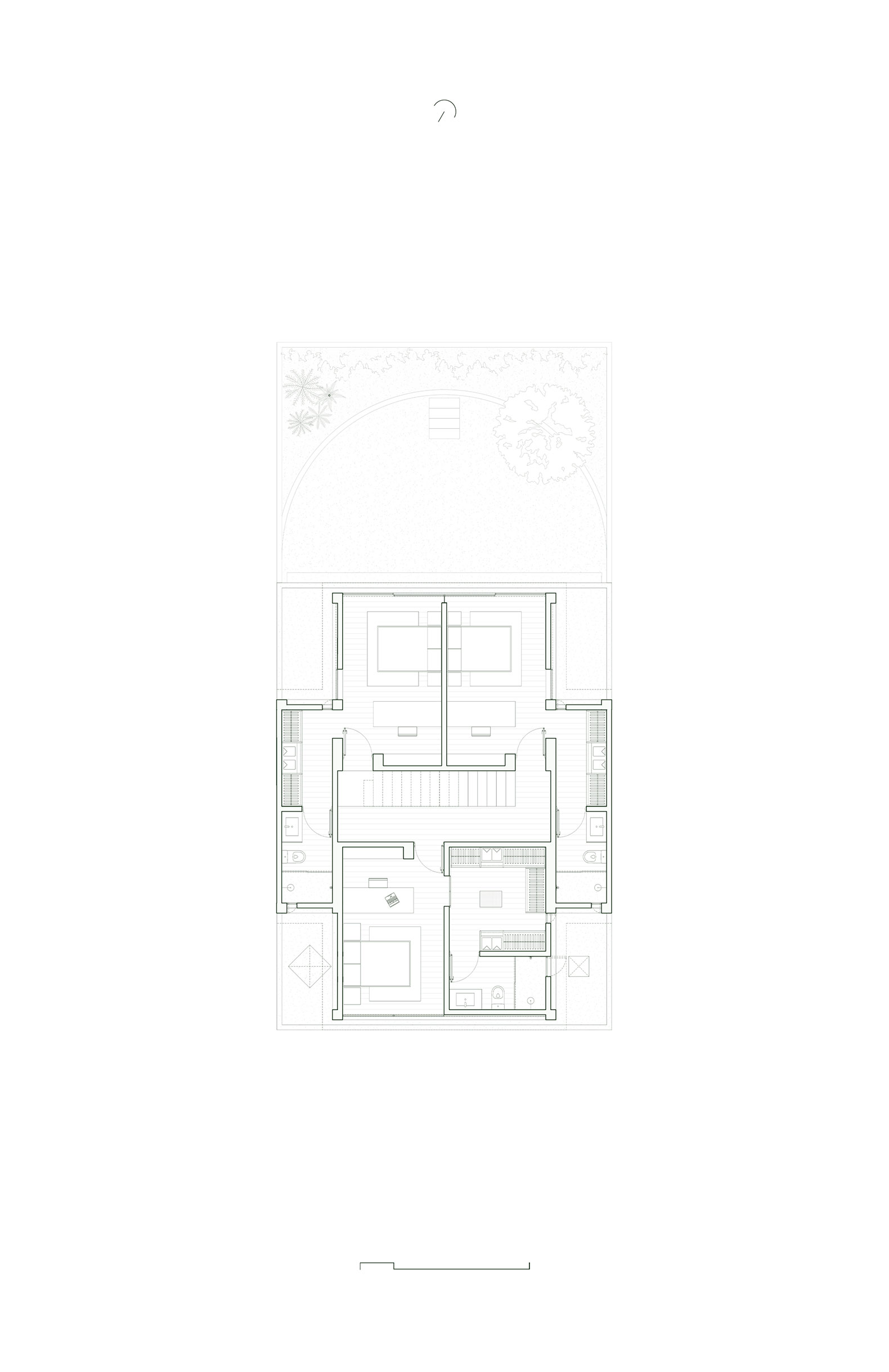 En la primera planta, la opacidad exterior hacia la calle se rompe con huecos de suelo a techo que se replican en la fachada interior, aprovechando la orientación de la luz natural. La planta, de geometría cruciforme, sitúa el dormitorio principal en fachada y los dos dormitorios secundarios hacia el interior, mirando al jardín.