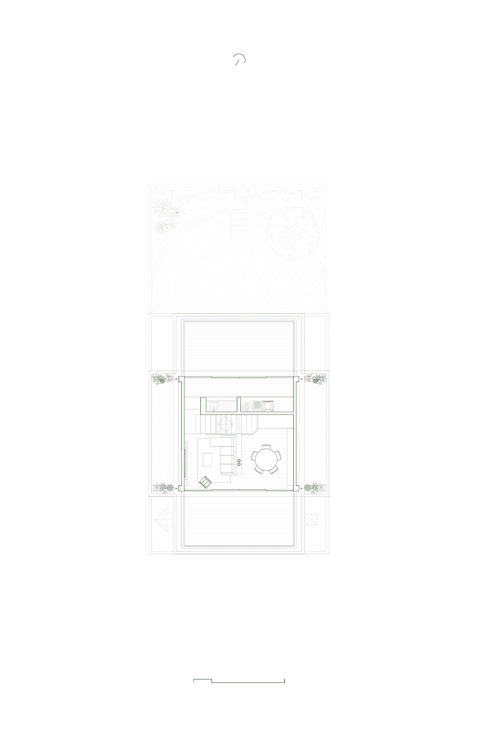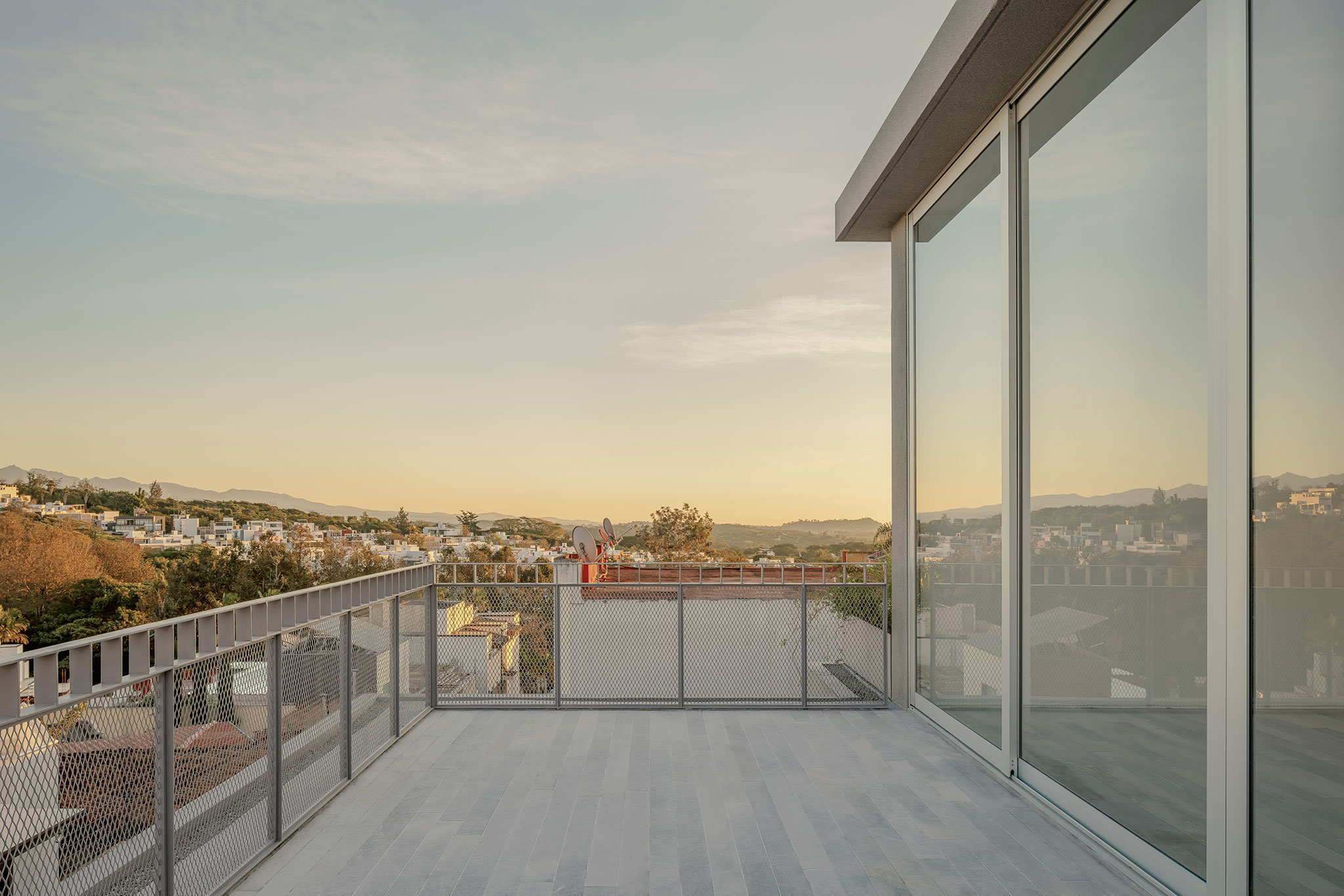 Sobre este estrato, el nivel superior se retrae conscientemente de sus bordes. La estancia y el estudio se funden bajo un mismo límite, un continuo espacial iluminado por la luz del ocaso. Al exterior, generosas terrazas —elevadas ya sobre las construcciones vecinas— extienden este plano habitable hacia el horizonte, convirtiendo el bosque y su densa vegetación en una postal.