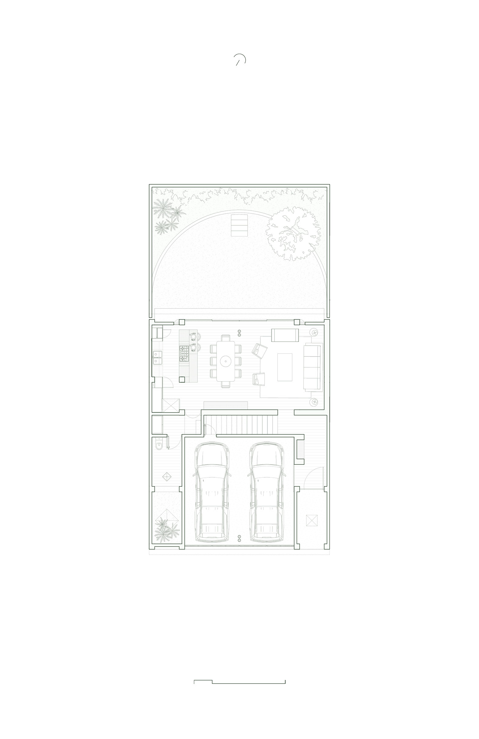 Programáticamente, López González organiza la casa situando los espacios sociales en la planta baja, conectados con un patio trasero donde un semicírculo de grava mineral abraza un árbol de guayacán, cuya floración marca las estaciones del año.