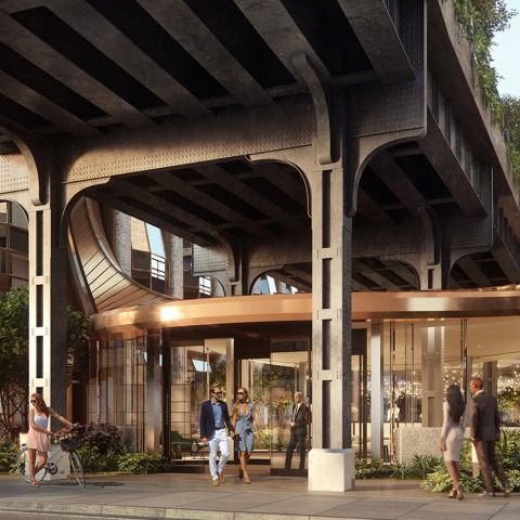 "A la gente le encanta vivir en lugares memorables. A medida que la increíble estructura de acero remachada de High Line atraviesa el centro de nuestro sitio, sabíamos que no debíamos perder la oportunidad de tomar prestada toda su textura y carácter para hacer una experiencia de llegada idiosincrática para el residentes del edificio.