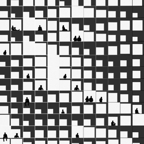 El diseño en blanco y negro de Gharandouqa representa un edificio de apartamentos con figuras humanas recortadas contra sus ventanas. Las formas modulares "transmiten la vida urbana y" un sentido de comunidad ", describe la UIA.