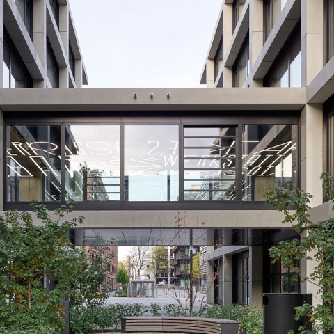 A través de espaciosas logias, terrazas en la azotea con vistas a la montaña y espacios de trabajo flexibles, los edificios iCampus crean un entorno de trabajo cómodo y preparado para el futuro. Arraigado en la apariencia racional del patrimonio industrial del sitio, con aberturas generosamente proporcionadas y un alto nivel de refinamiento, el conjunto se mezcla con el tejido urbano existente y ofrece una nueva capa contemporánea dedicada a la industria creativa.