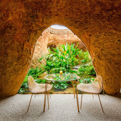Los jardines-patio no solo ayudaron a acentuar la idea de espacio cavernosos, de cuevas en contacto directo con la naturaleza, por ellos se desplegaron las instalaciones, tuberías y conductos de ventilación para que no molesten en la vivienda ni en el restaurante.
