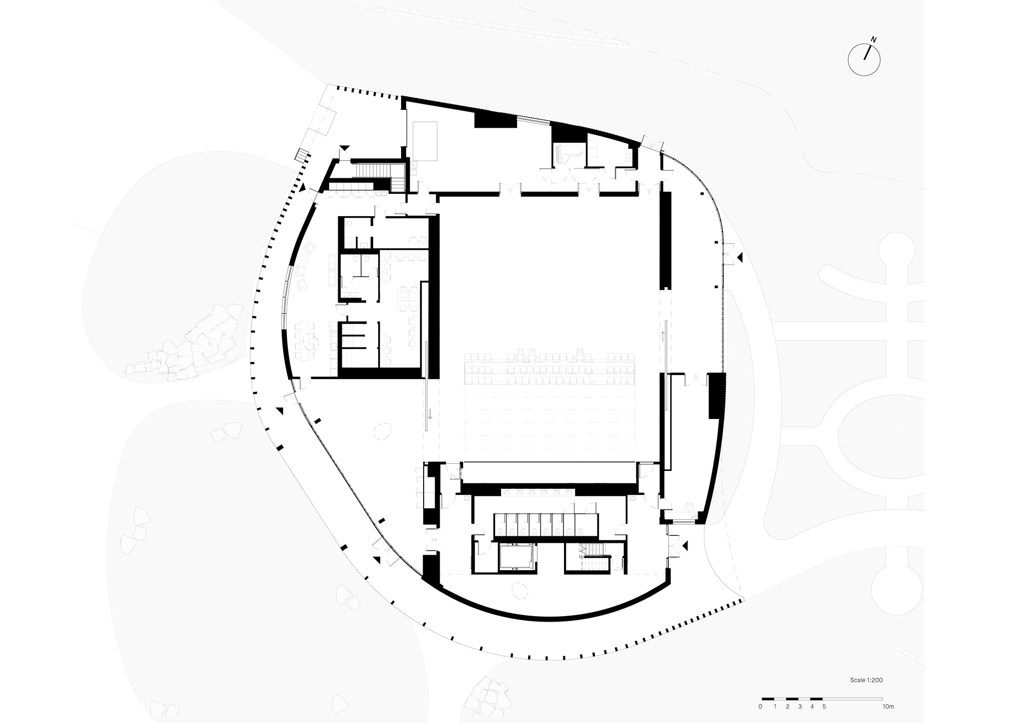 El proyecto se inspira en los ritmos de la naturaleza, reflejando la fluidez y la gracia de los bailarines. Cada elemento está concebido para favorecer el movimiento y la transición: desde las formas suaves y escultóricas que evocan el relieve del entorno, hasta los espacios abiertos y permeables que invitan a la luz, el aire y el sonido a fluir sin esfuerzo entre el interior y el exterior. El edificio se convierte en una danza en sí mismo, en constante cambio y adaptación, al igual que el arte que alberga. El espacio escénico flexible del teatro encarna esta filosofía, ofreciendo configuraciones adaptables a una amplia gama de representaciones, desde encuentros íntimos hasta presentaciones digitales de gran escala.